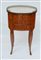 Tavolino da centro di forma ovale con tre cassetti con fronte e fianchi filettati in legni vari, gambe mosse munite di scarpette in bronzo dorato, piano in marmo con ringhiera traforata. Fine secolo XVIII (cm 43x70x30) (difetti e restauri)