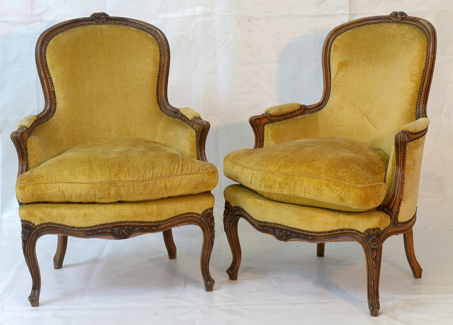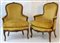 Coppia di poltrone con cimasa intagliata a fiori, braccioli scanalati, gambe mosse, rivestite in velluto color ocra (difetti)