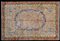 Decoro francese di ispirazione Aubusson con ghirlanda di rose e fiori policromi avvolti da un nastro in tonalità di azzurro sopra un campo color rosa antico decorato da fiori sparsi in tonalità più chiara. Mazzolini di rose agli angolari, legati da asole in nastro azzurro. Bordura ad imitazione di cornice di quadro formata da foglie nei toni del tabacco, nocciola, beige e bianco, legate da nastro nelle tonalità di azzurro. Bordura esterna a fondo cammello con fiorellini rosa (cm 350x248) (lievi difetti)