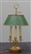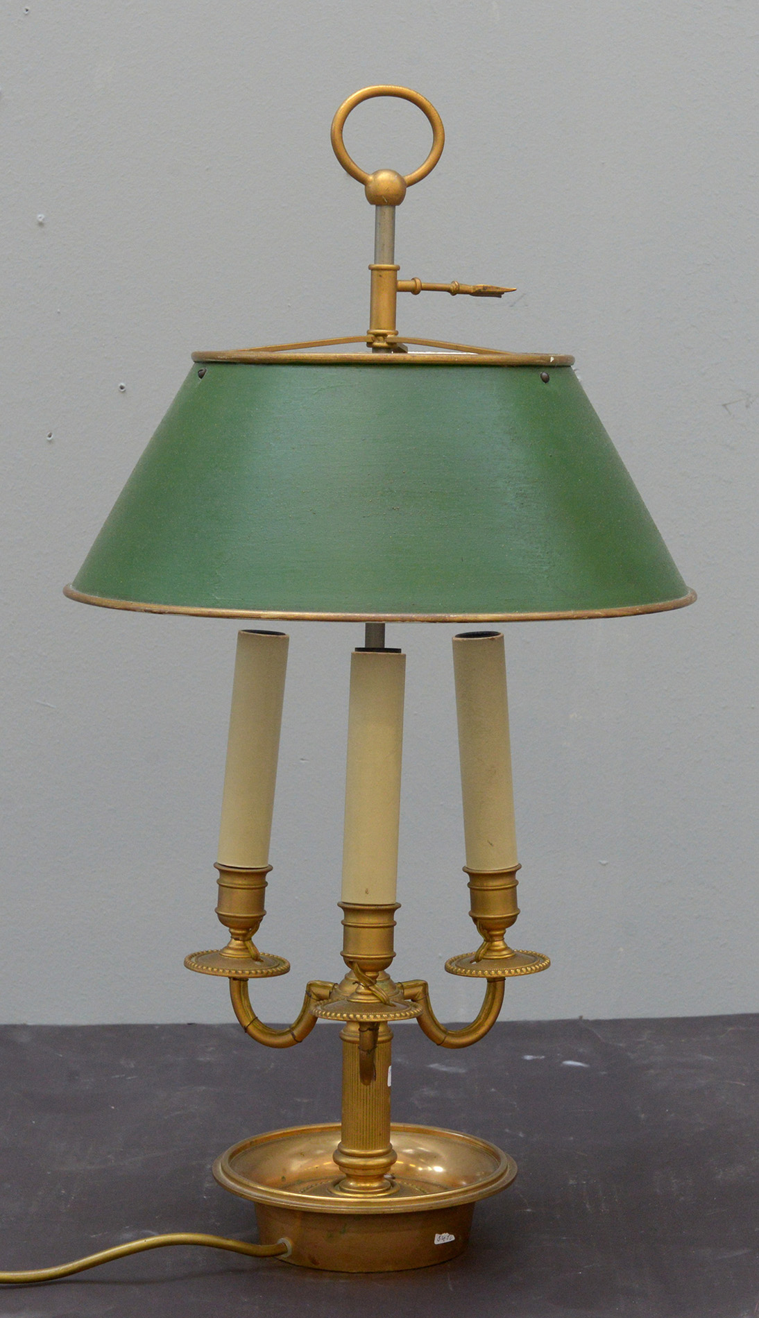Lotto 144 | Bouillotte a tre fiamme in bronzo dorato, paralume in metallo laccato regolabil