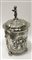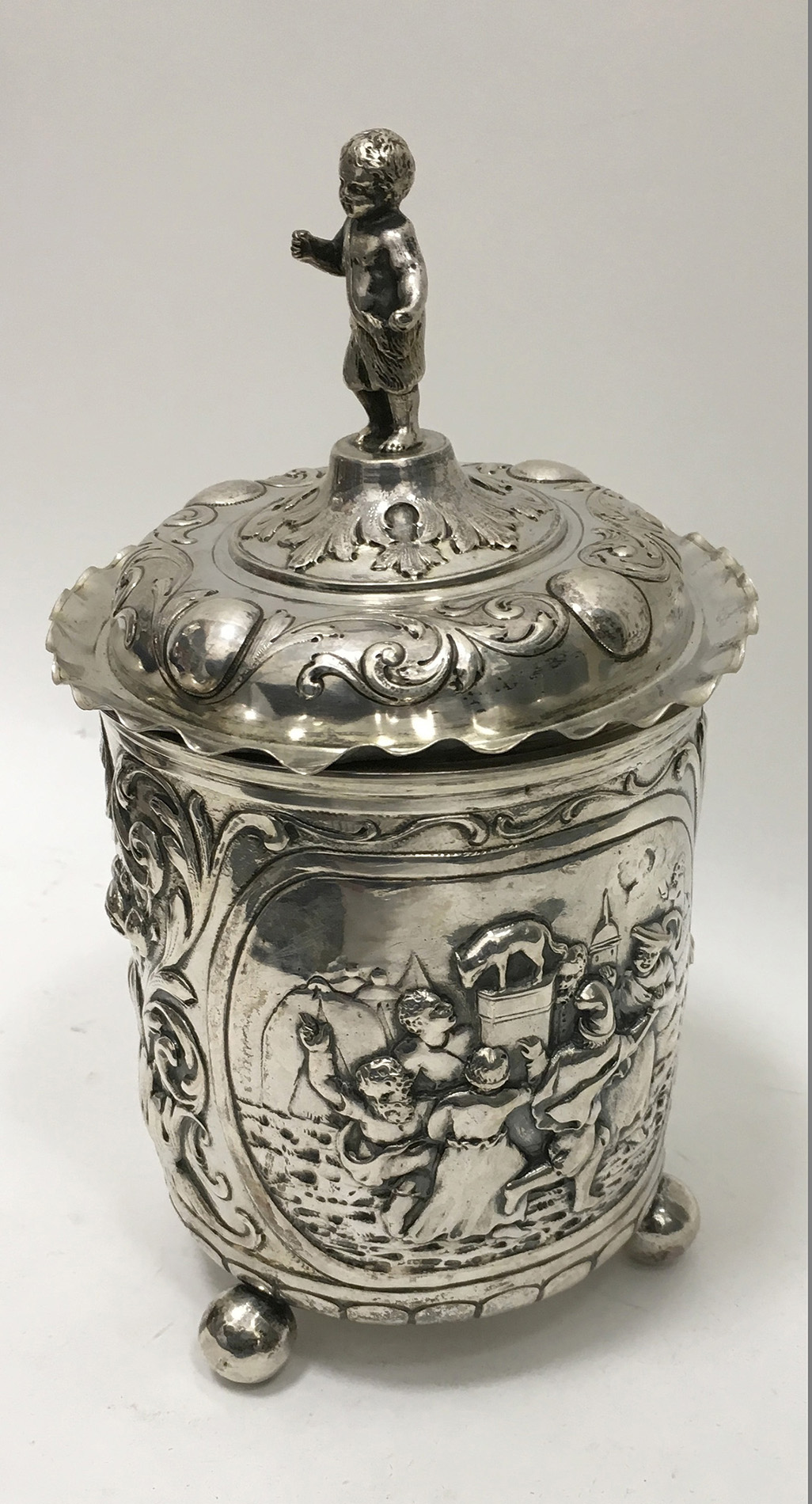 Scatola in argento con corpo sbalzato a motivi vegetali e scene di 'Mosè con le tavole' e 'Adorazione dell'Agnello Sacro' entre riserve, coperchio di forma mossa sormontato da figura a tutto tondo, piedi sferici. Fondo decorato con moneta (h. cm 19,5) (g 380 ca.) Punzoni abrasi. Germania, secolo XIX (lievi difetti)