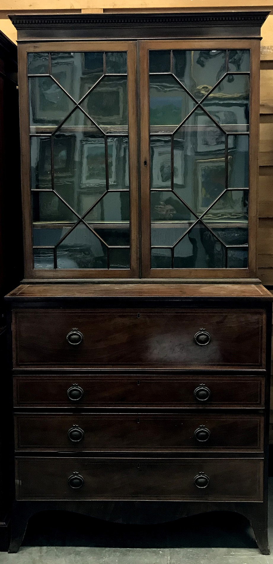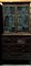 Mobile a due corpi filettato in legni vari a decori geometrici. Parte superiore a due a vetri. Parte inferiore a tre cassetti e uno finto con scarabattolo celante vani e cassettini con pomoli intagliati in avorio. Inghilterra, secolo XIX (cm 107x220x54) (difetti)