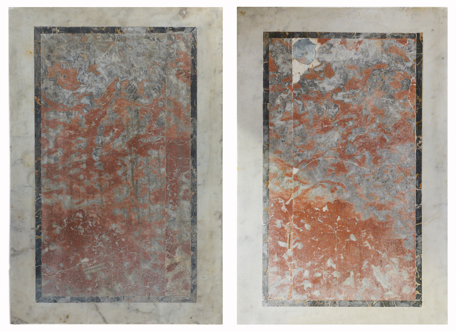 Coppia di piani in marmo bianco e riquadri con all'interno breccia in marmo rosa. Secolo XIX (cm 70x100) (difetti e mancanze)