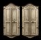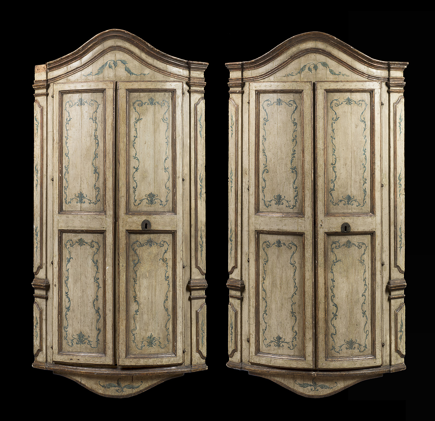 Coppia di angoliere pensili a due ante in legno laccato decorato a fregi fogliati, parte inferiore sagomata, cimasa mossa. Genova, secolo XVIII (cm 58x152) (difetti)