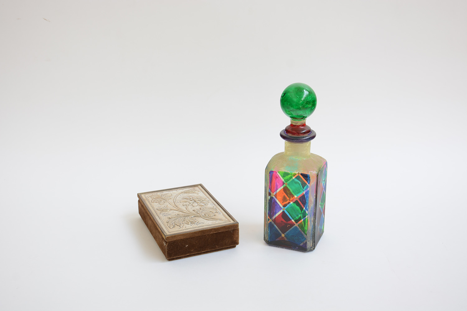 Lotto composto da una bottiglia in vetro e una scatola in velluto con coperchio