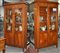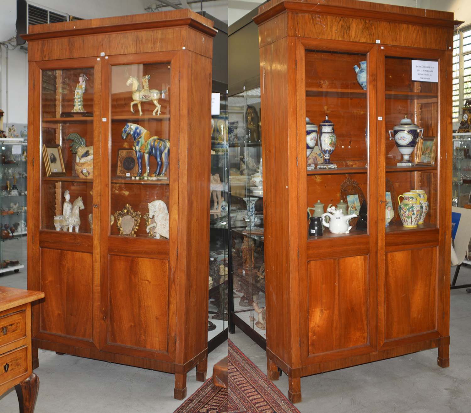 Coppia di vetrine in noce a due ante a vetri, fascia superiore ed inferiore lastronate in radica, piedi a pilastro. Secolo XIX ( cm 130x237x45)(difetti)