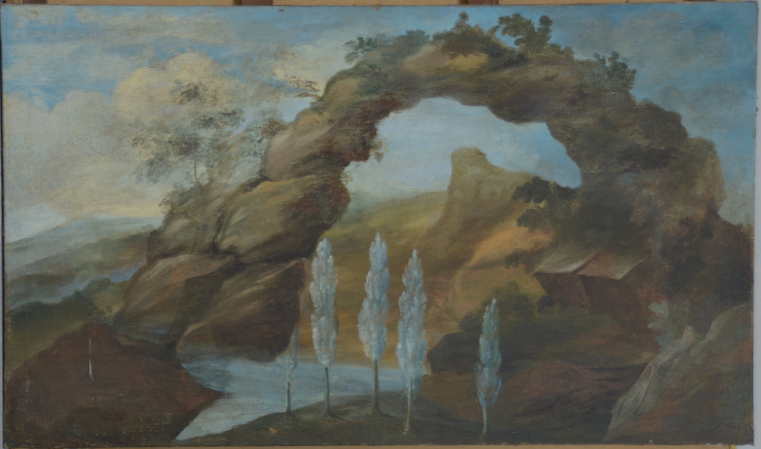 Ignoto "Paesaggio" antico dipinto ad olio su tela (cm 98x165) (difetti)