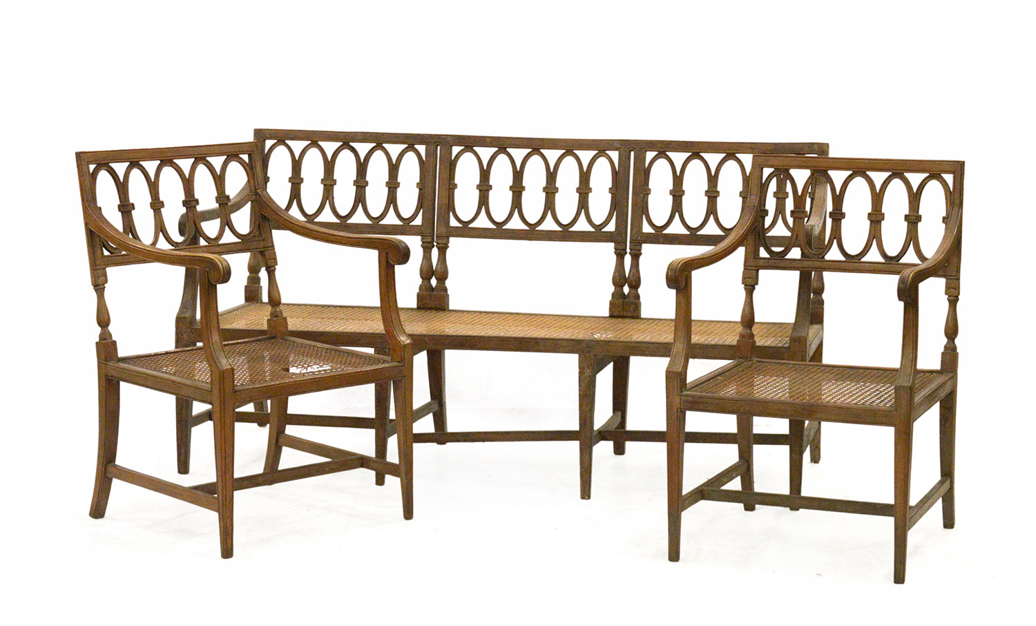 Fornitura da salotto composta da un divano a tre posti e due poltrone in legno con schiedali a giorno e sedute incannucciate, secolo XVIII (difetti e mancanze)
