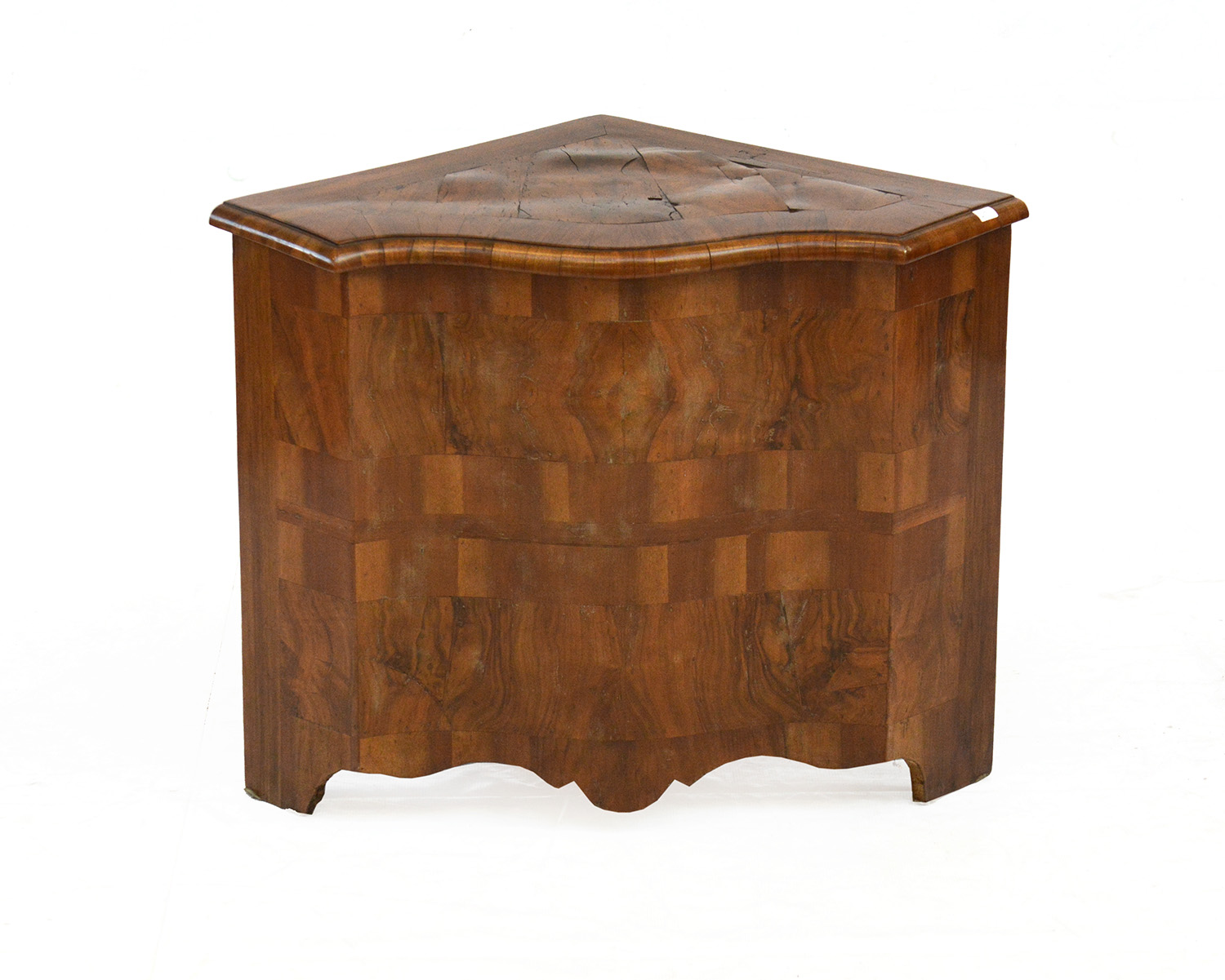 Legnaia ad angolo lastronata in noce. Secolo XVIII (cm 73x55x50) (difetti)
