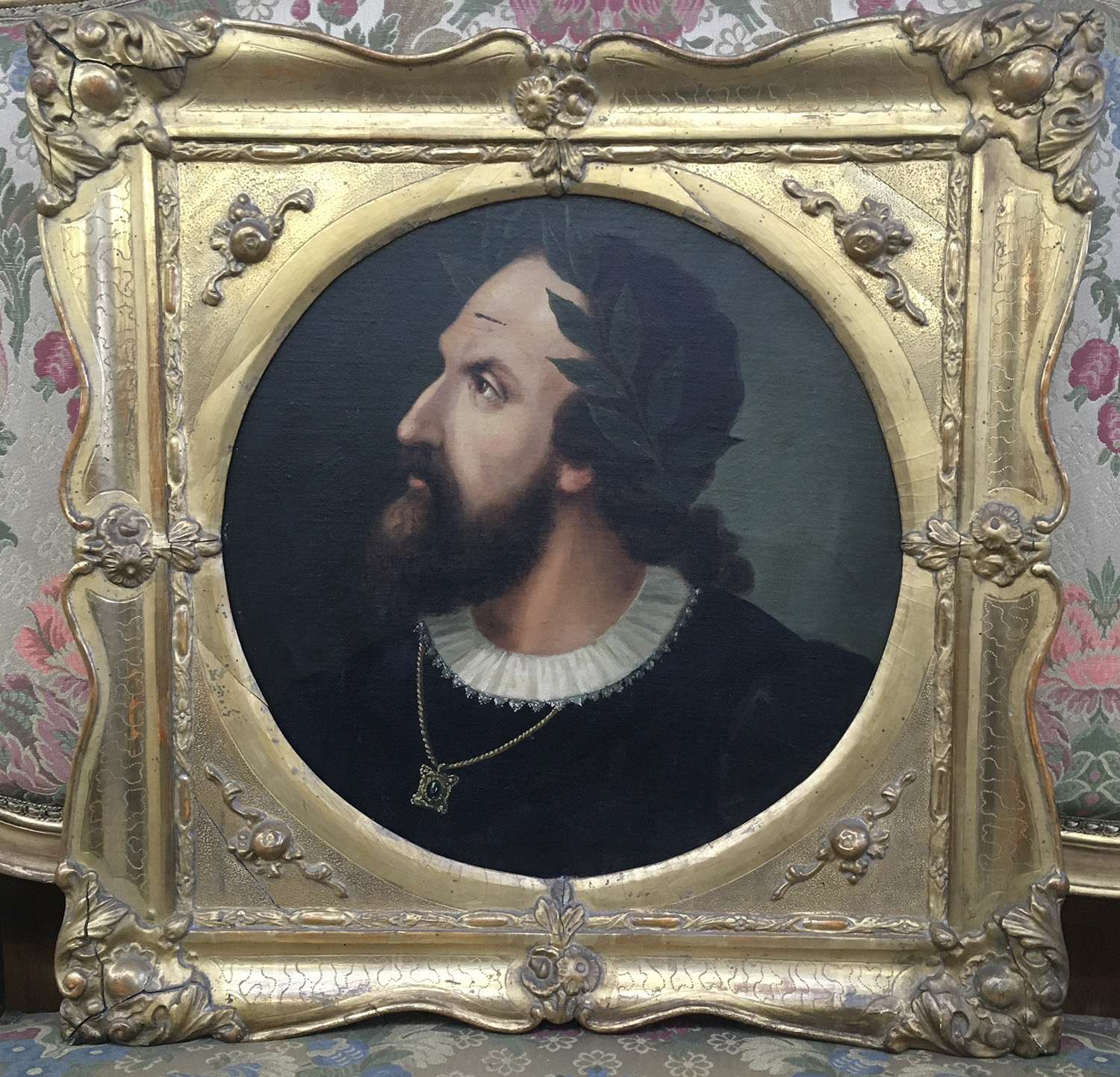 Scuola del secolo XIX "Ritratto ideale di Ludovico Ariosto" olio su tela (cm 47x42) In cornice del secolo XIX in legno e pastiglia dorati (difetti)