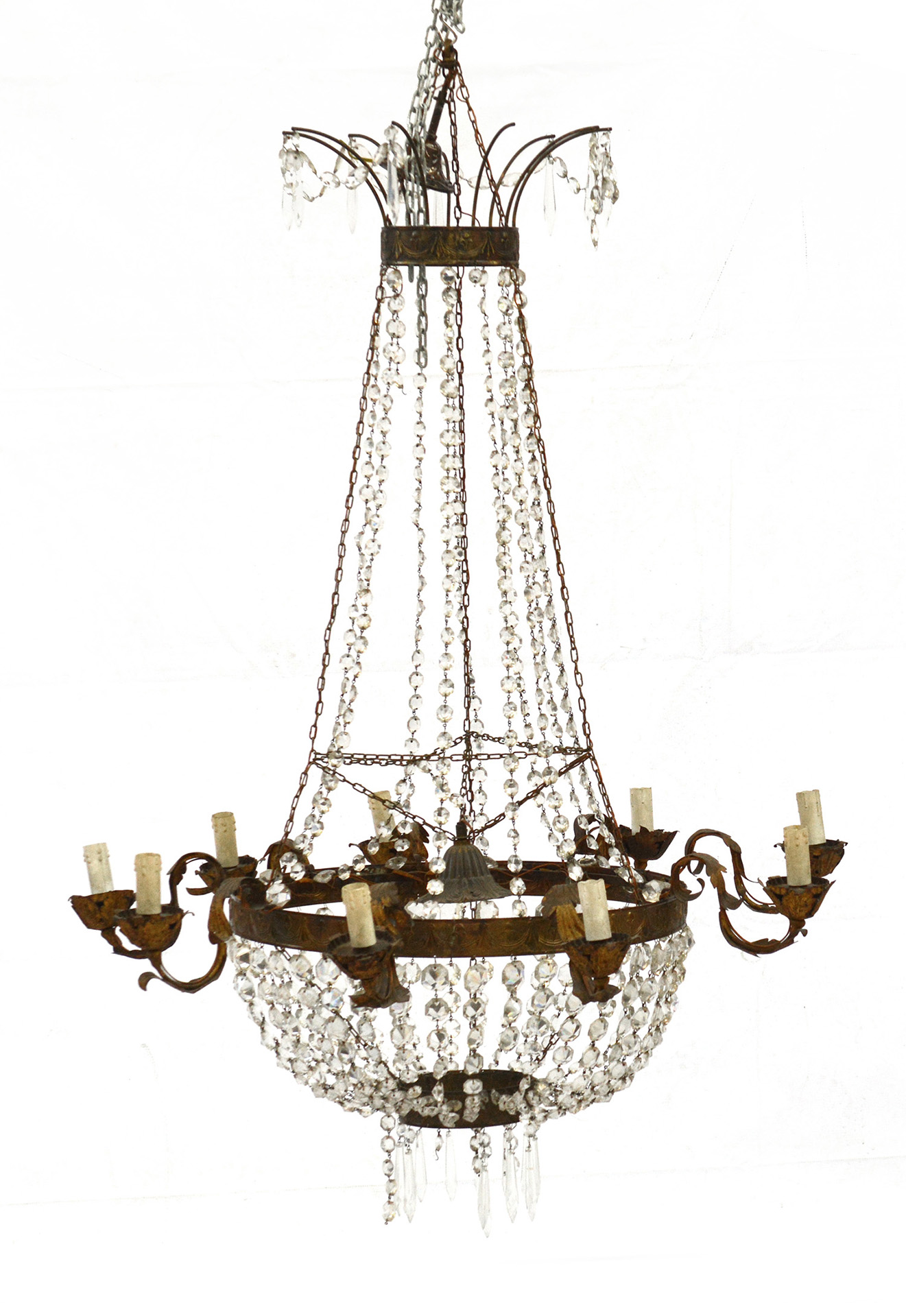 Lampadario a cesto in stile impero a nove luci decorato con pendagli (cm 110) (difetti)