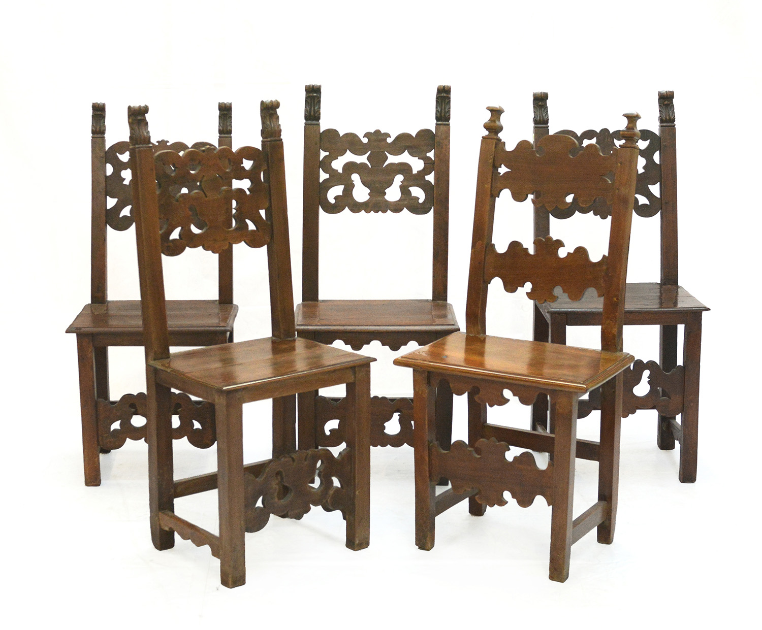 Lotto composto da cinque sedie con schienale e montanti intagliati e traforati