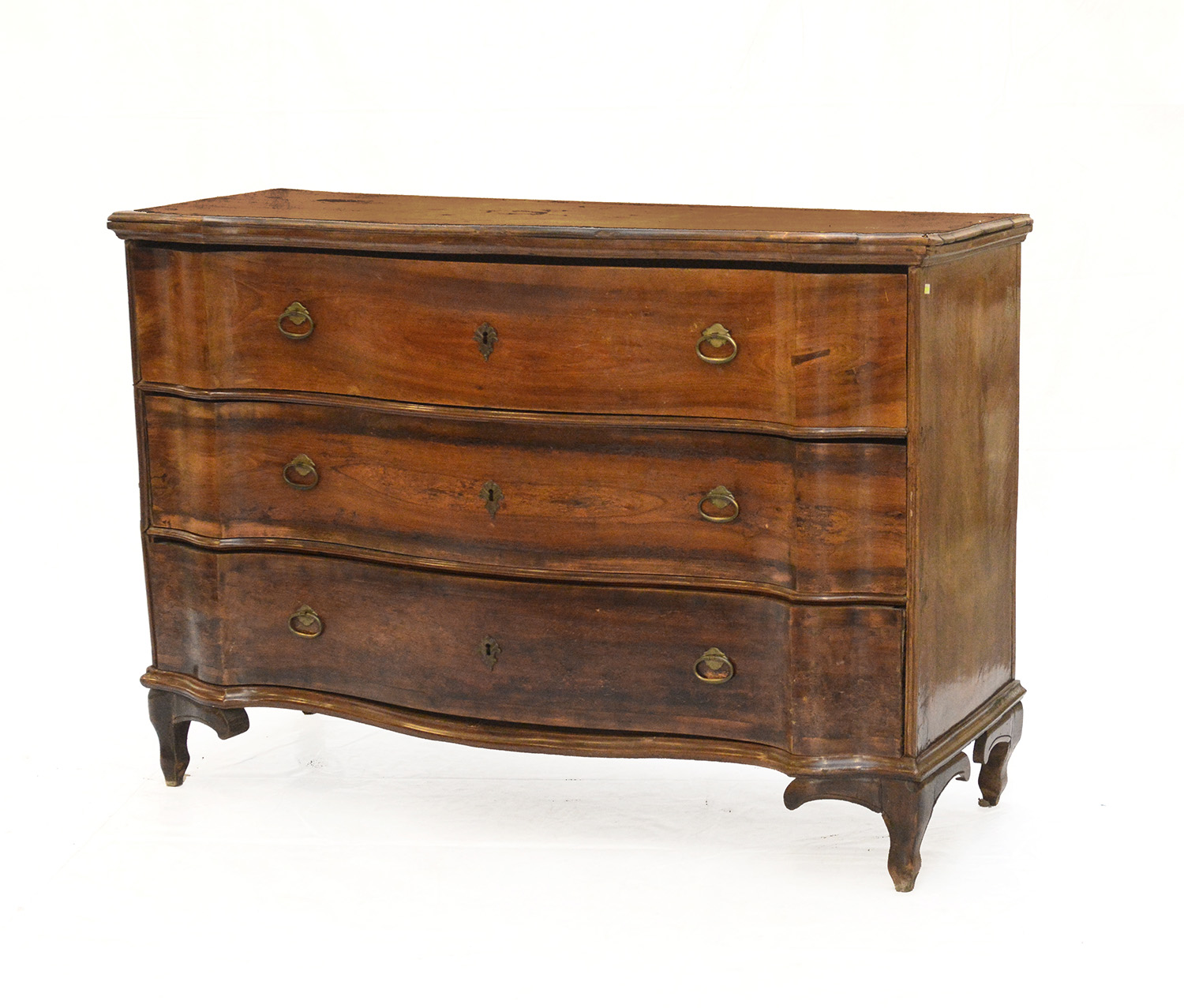 Cassettone con fronte mosso a tre cassetti e piedi sagomati. Secolo XVIII (cm 146x101x60) (difetti)