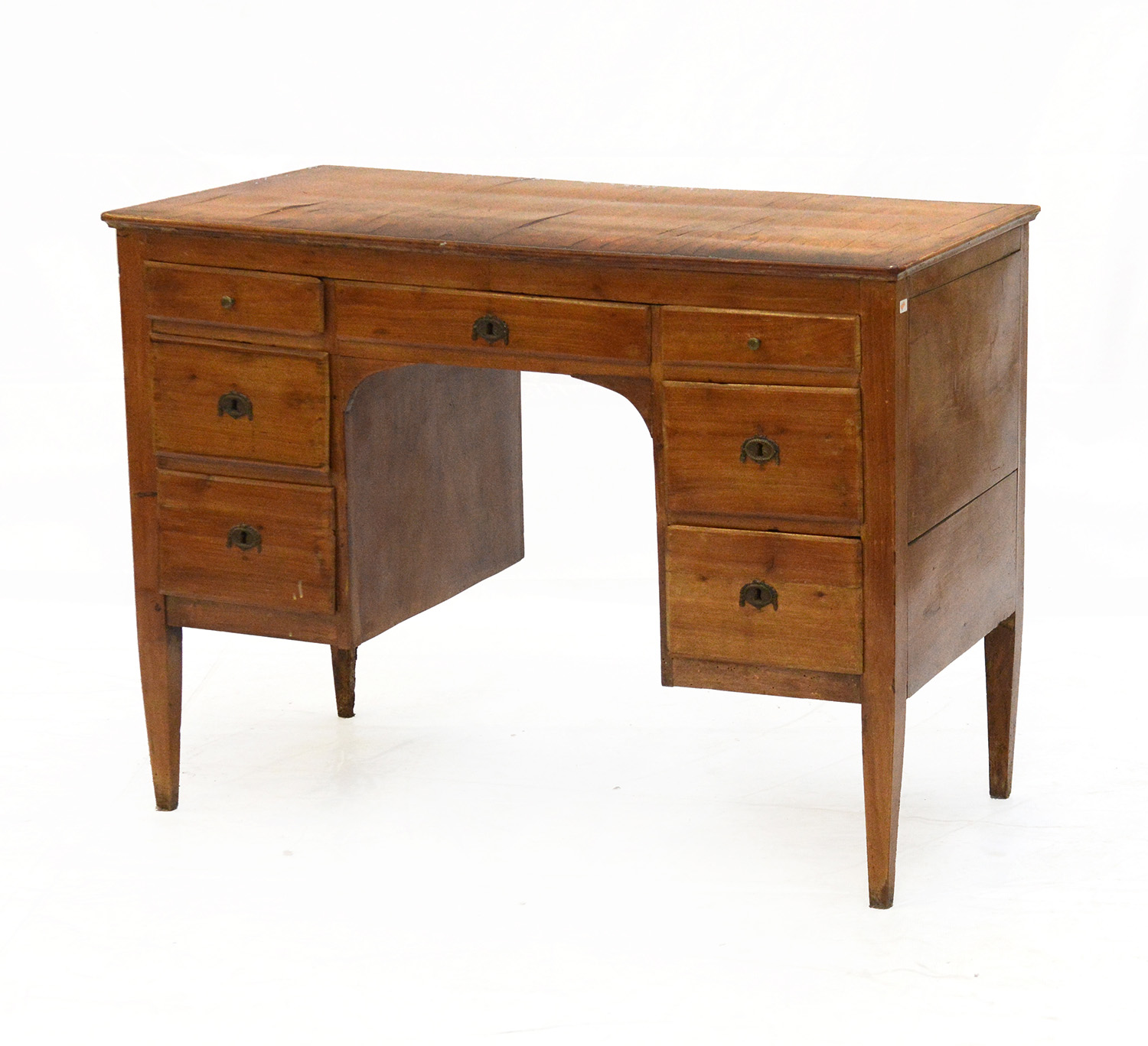 Scrivania da centro lastronata in noce a sette cassetti e gambe rastremate. Secolo XVIII (cm 106x77x55) (difetti e restauri)