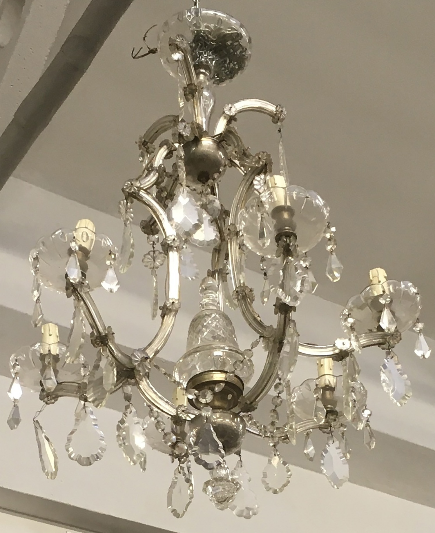Lampadario a sette luci in metallo rivestito in vetro e decorato a pendagli (h. cm 90) (difetti e mancanze)
