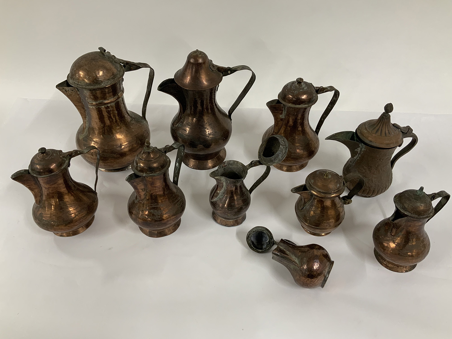 Lotto di dieci cuccume in rame di forme e capienze differenti (difetti)
