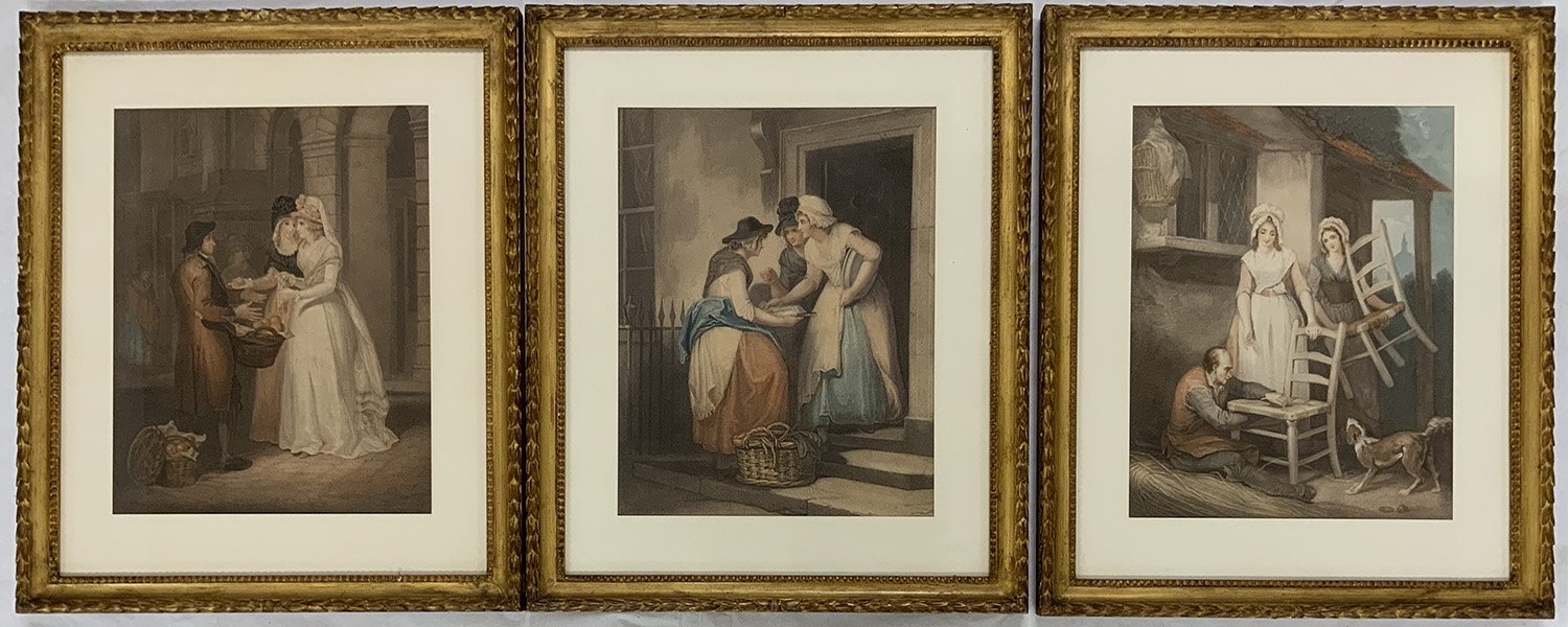 Gruppo di tre acquatinte inglesi della serie "Cries of London", (cm 35x28), in cornice (lievi difetti)