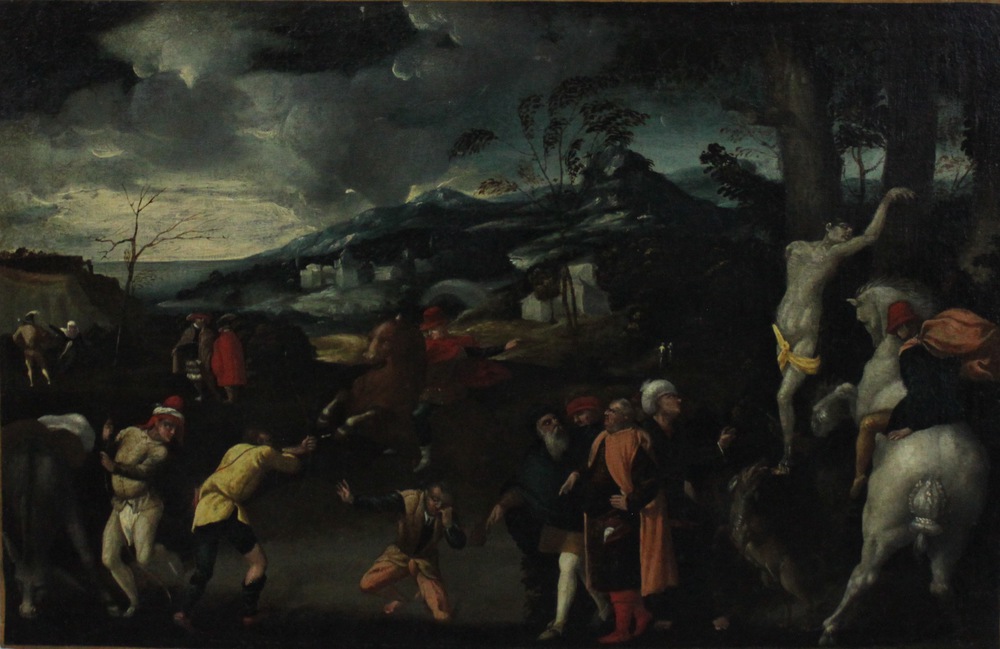La bella opera tanto affascinante quanto bizzarra richiama fortissimamente la personalità pittorica di Giuseppe Caletti detto il Cremonese. Del pittore si ricordano la sua vita dissennata passata nelle taverne e la sua megalomania che lo vedeva porsi al pari di Tiziano. L'impianto e la resa paesaggista riporta inequivocabilmente alla lezione di Dosso Dossi, Giovanni Francesco di Niccolò Luteri (San Giovanni del Dosso 1489 - Ferrara 1542), da sempre ritenuto la fonte ispiratrice di Caletti. Tra i dolci declivi e il primo piano vi sono diversi personaggi, a cavallo o a piedi in abiti popolari o nobiliari sino al turbante orientale portato dal personaggio rivolto al santo, tutti abbigliati con vistose vesti dai colori sgargianti. Non è chiaro cosa leghi i personaggi tra loro, piuttosto siamo di fronte ad un saggio di pittura in cui Caletti, da far suo, imita, con bizzarria e bravura, i grandi del passato a cui si ispirava, come: Tiziano (Pieve di Cadore 1490 - Venezia 1576) e Giorgione (Castelfranco Veneto 1478 û Venezia 1510) nel gruppo di quattro personaggi, dall'aria di antichi filosofi, posti ai piedi del santo, il solito Dossi per la serie di figure sparse dal gusto nordico e caricaturale, infine Raffaello (Urbino 1483 - Roma 1520) e Giulio Romano (Roma 1499 - Mantova 1546) nel bel destriero in basso a destra.