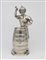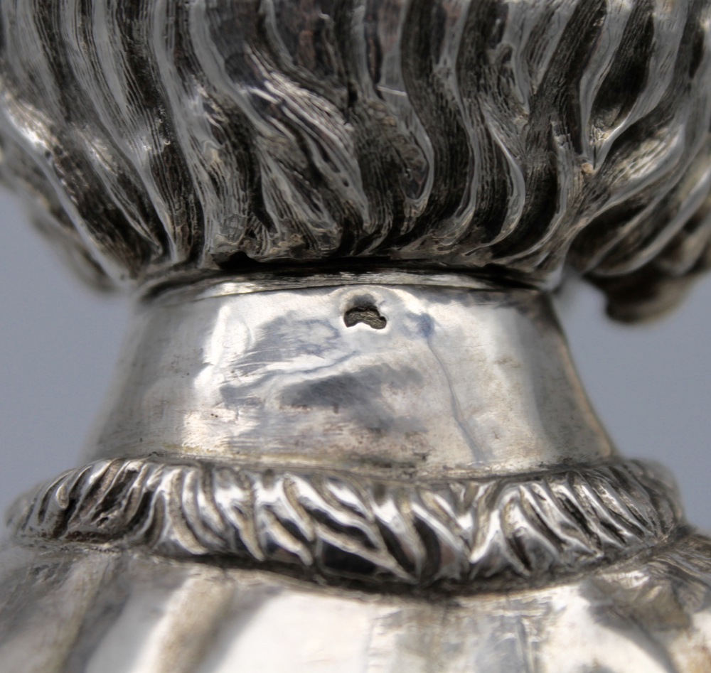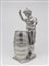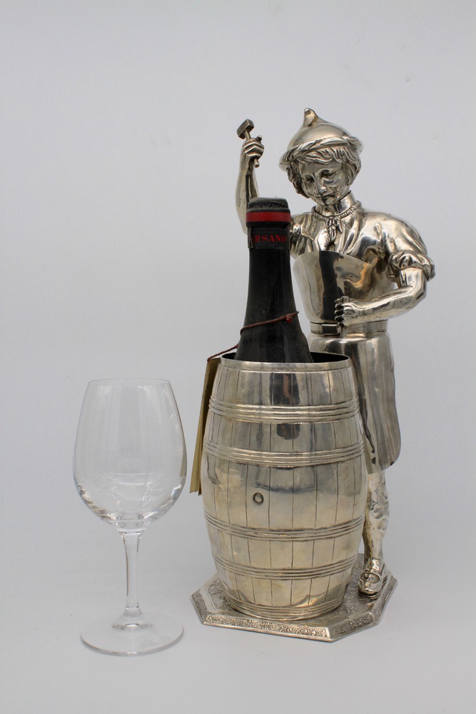 La parte superiore presenta uno stemma e due leoni; l'estremità della botte, estraibile, funge da elegante sottobicchiere; la testa anch'essa estraibile, funge da tappo. La base, ottagonale, è decorata con motivi cesellati fitomorfi.