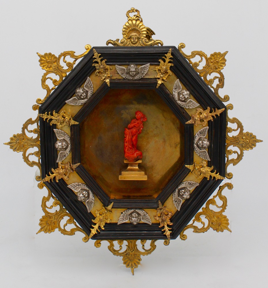 Raffigurante figura femminile, entro cornice ottagonale in bronzo ed ebano, con applicazioni in argento