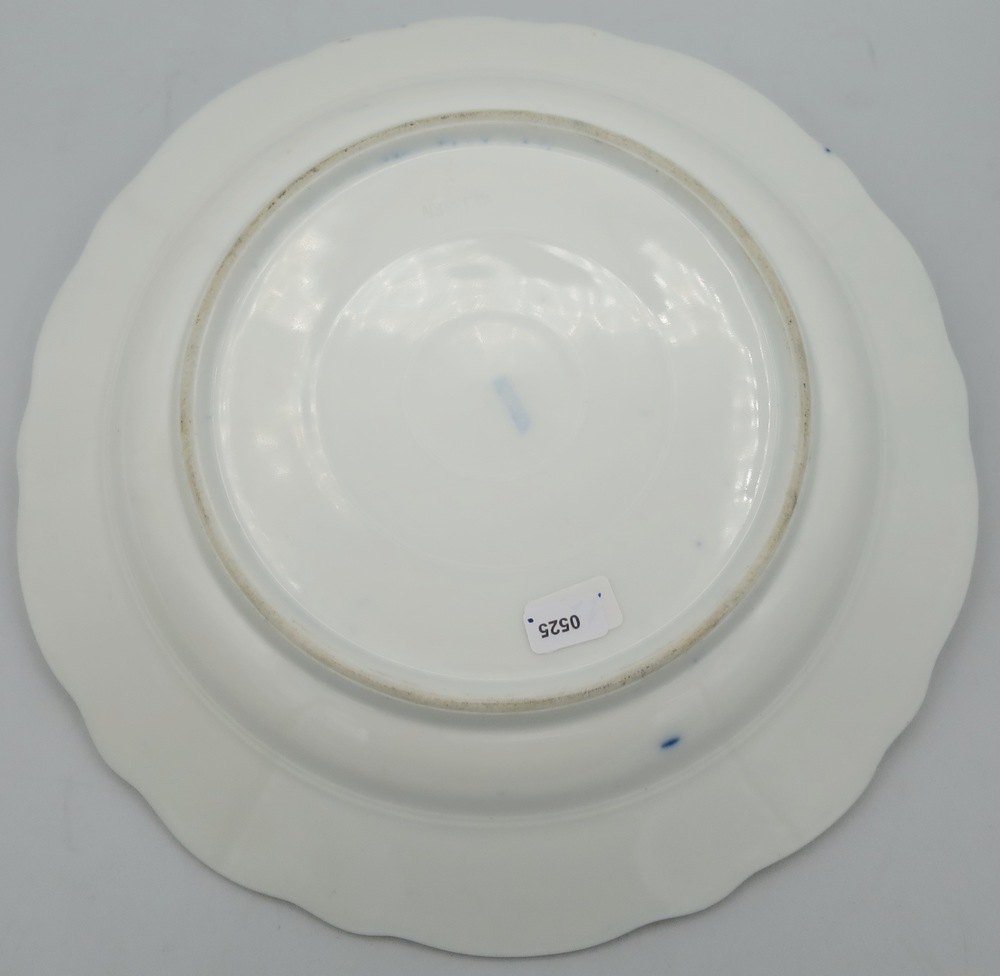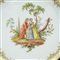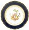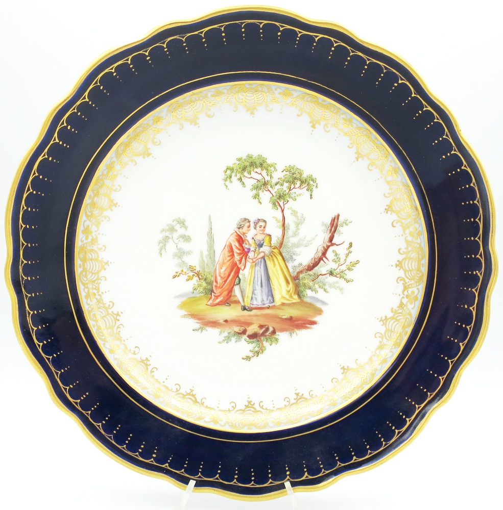 Piatto in porcellana decorato con scena campestre , tesa in blu con decorazioni geometriche in oro zecchino