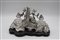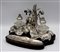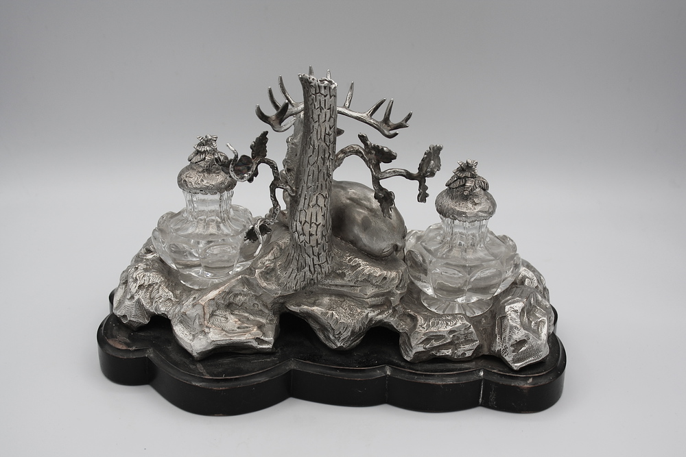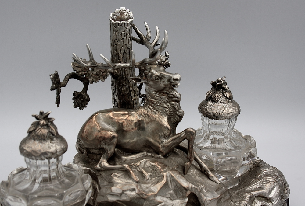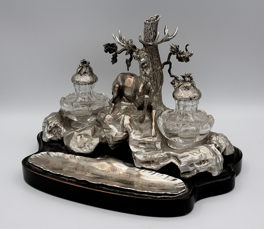 A foggia di cervo sdraiato, poggiante su base in legno ebanizzata, con flaconi in cristallo sagomato. Dedica incisa sul piano portapenne.