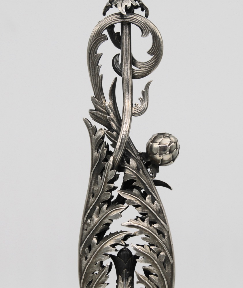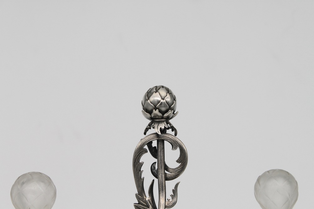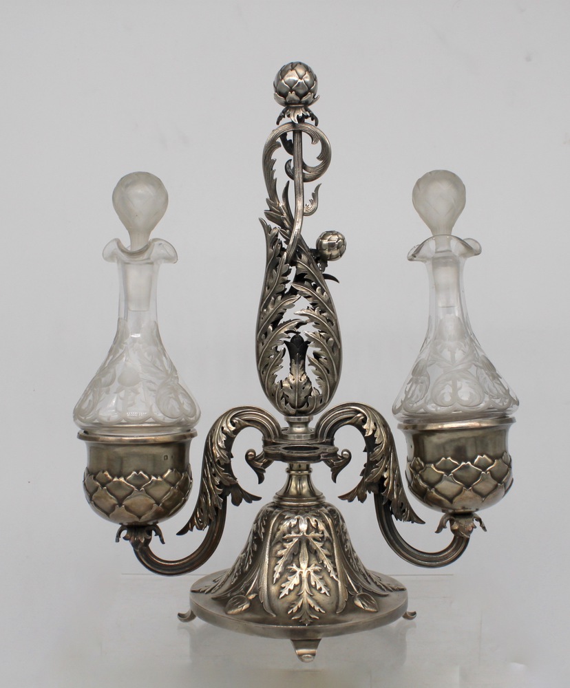 Corpo riccamente decorato con motivi vegetali, bottiglie originali in cristallo decorate con lo stesso motivo presente nel corpo dell'oggetto