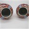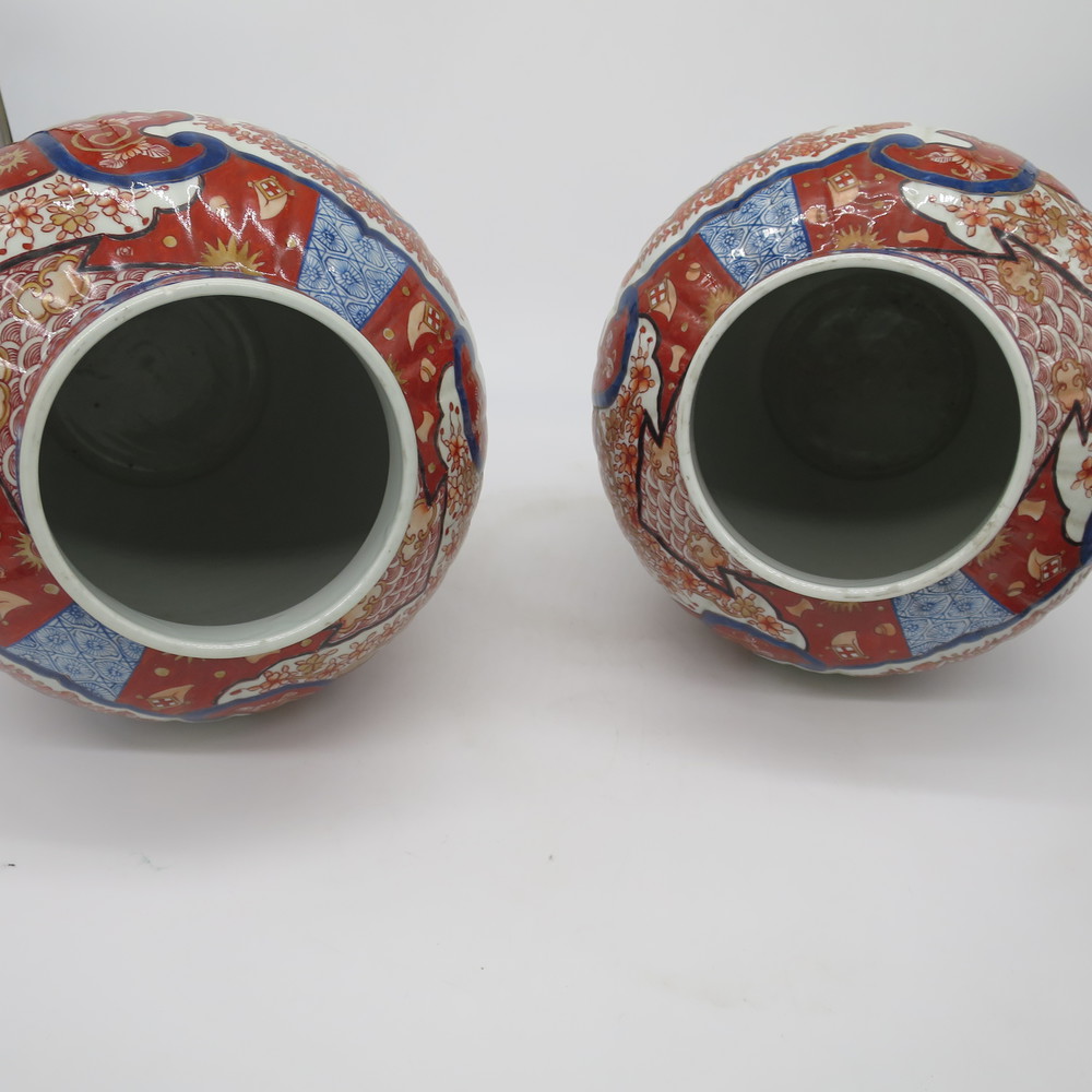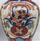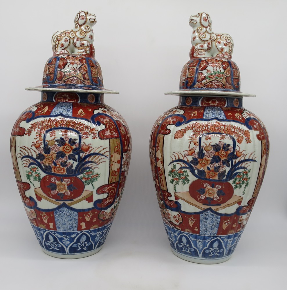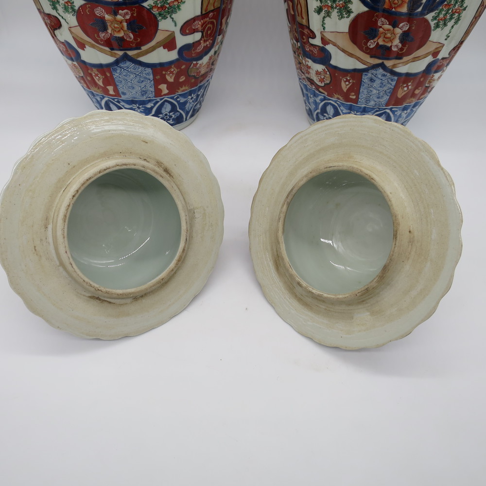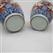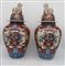 Coppia di potiche in porcellana a decoro policromo con fiori , piante e disegni geometrici stilizzati