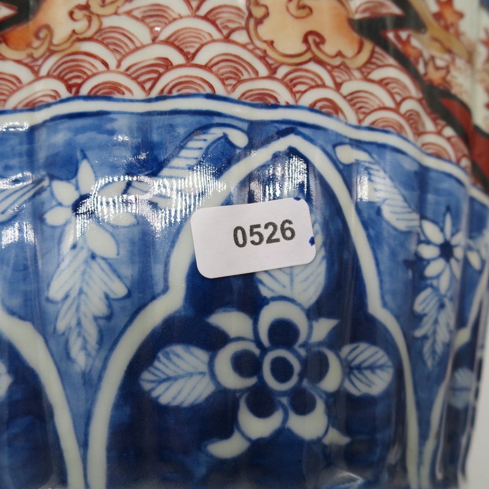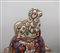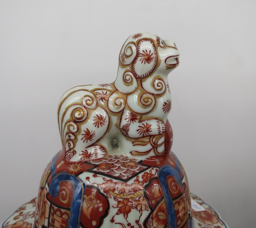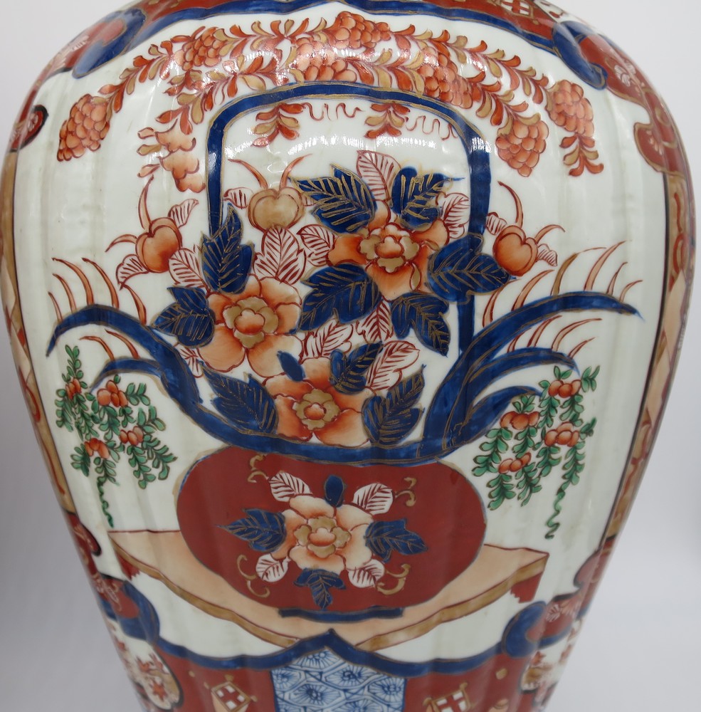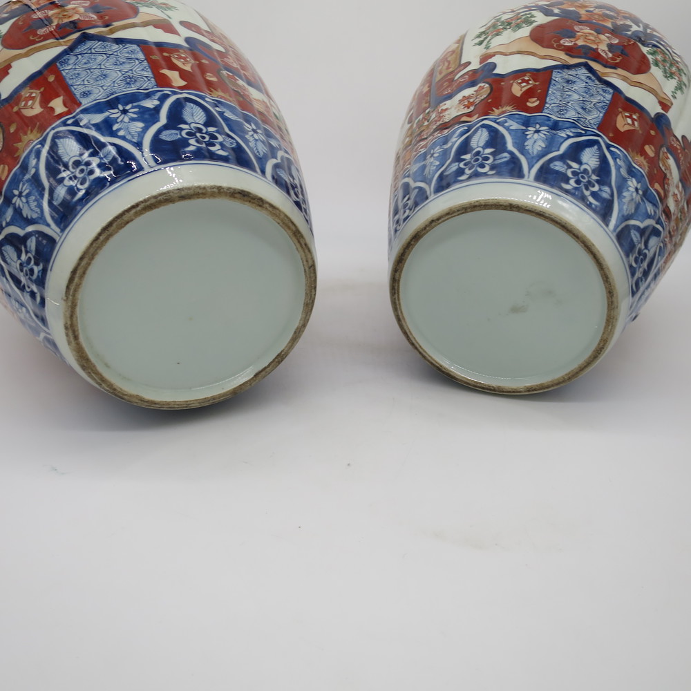 Coppia di potiche in porcellana a decoro policromo con fiori , piante e disegni geometrici stilizzati