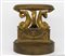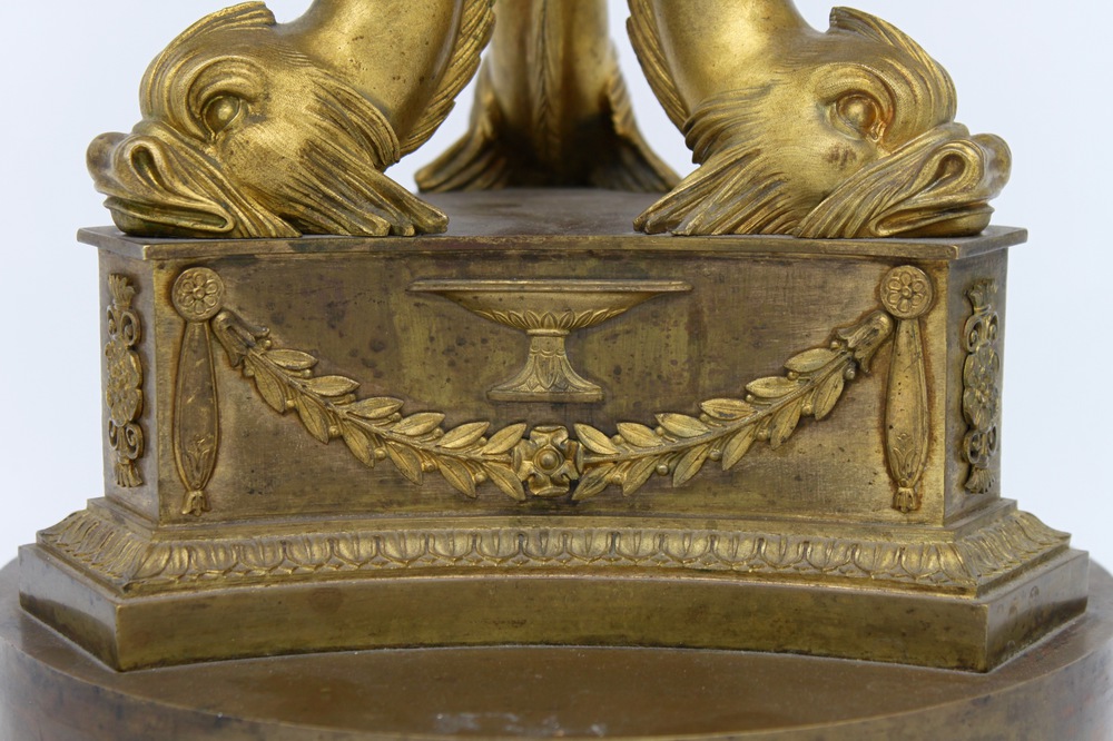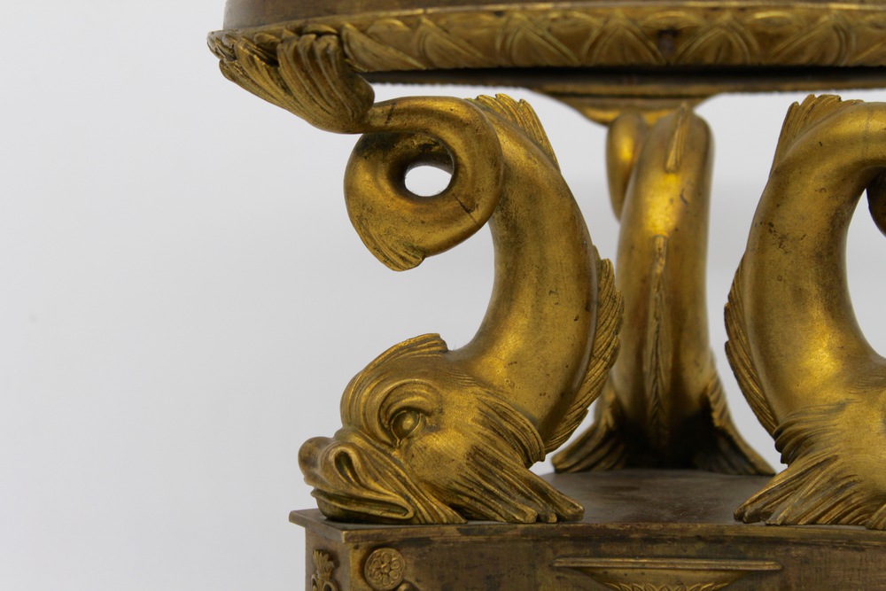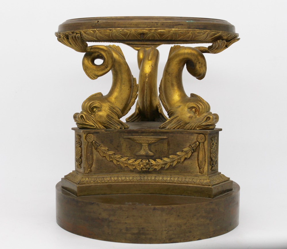 Corpo rappresentato a foggia di tre delfini arrotolati a sostenere elemento circolare decorato, poggianti su base triangolare sagomata a decori neoclassici, a sua volta poggiante su base circolare liscia.