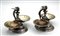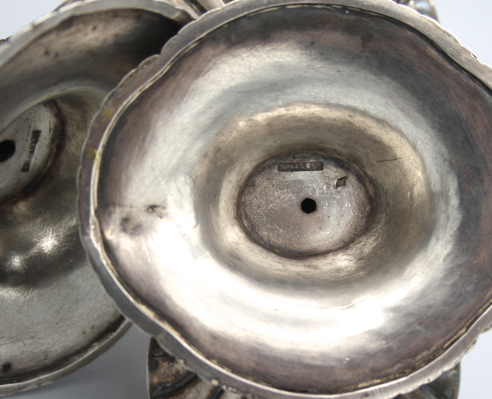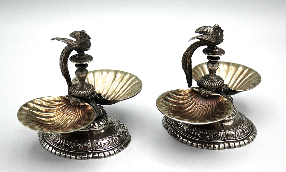 Impugnatura centrale a foggia di gallo cedrone vaschette porta sale a forma di conchiglia dorate, basi sagomate con decoro.