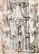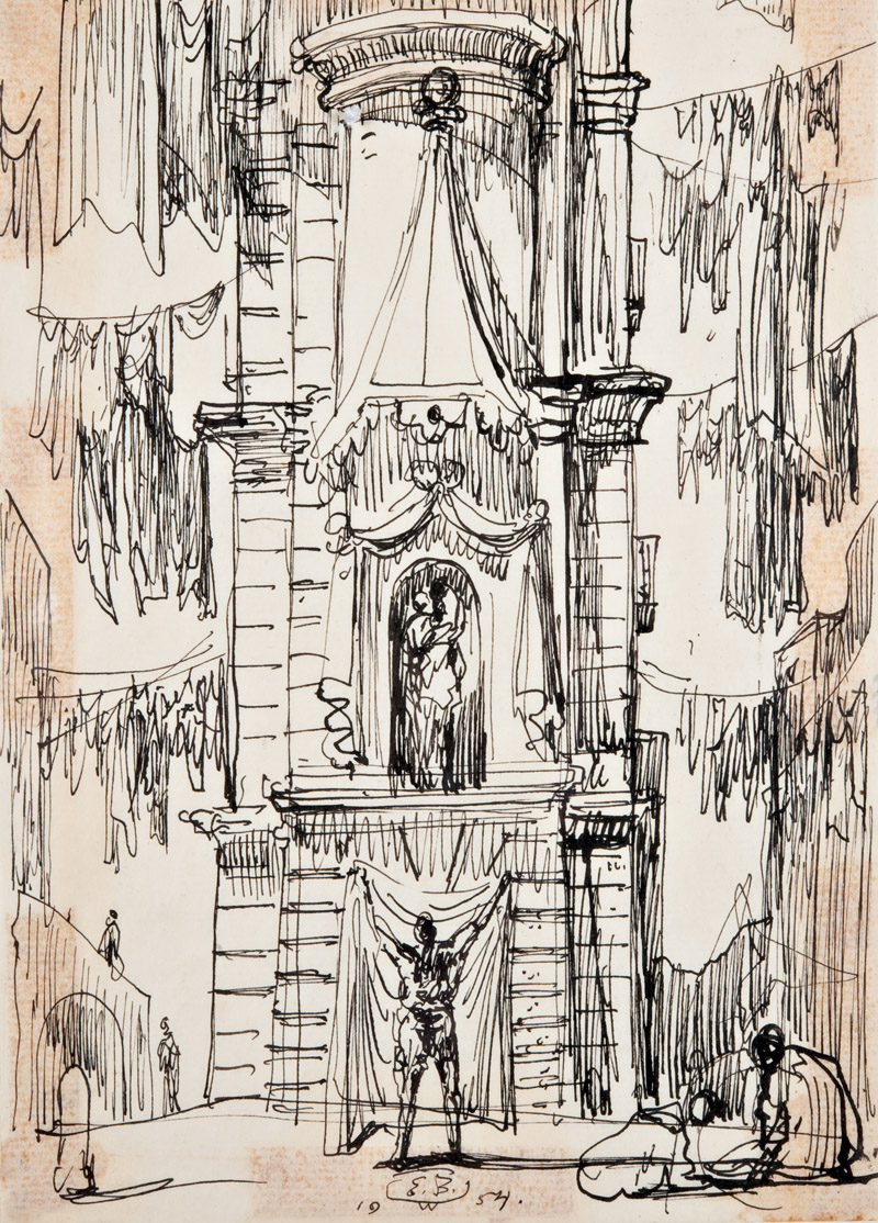 Eugene Berman (San Pietroburgo 1899 ‑ Roma 1972) “Figura che stende i panni” 1954 Inchiostro su carta (cm 22,3x15,8) Siglato e datato 1954 in basso al centro
