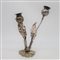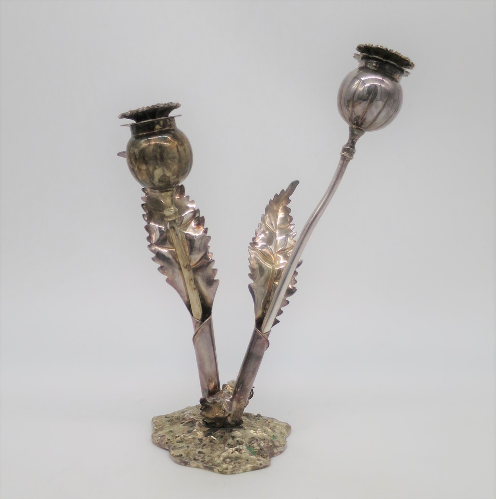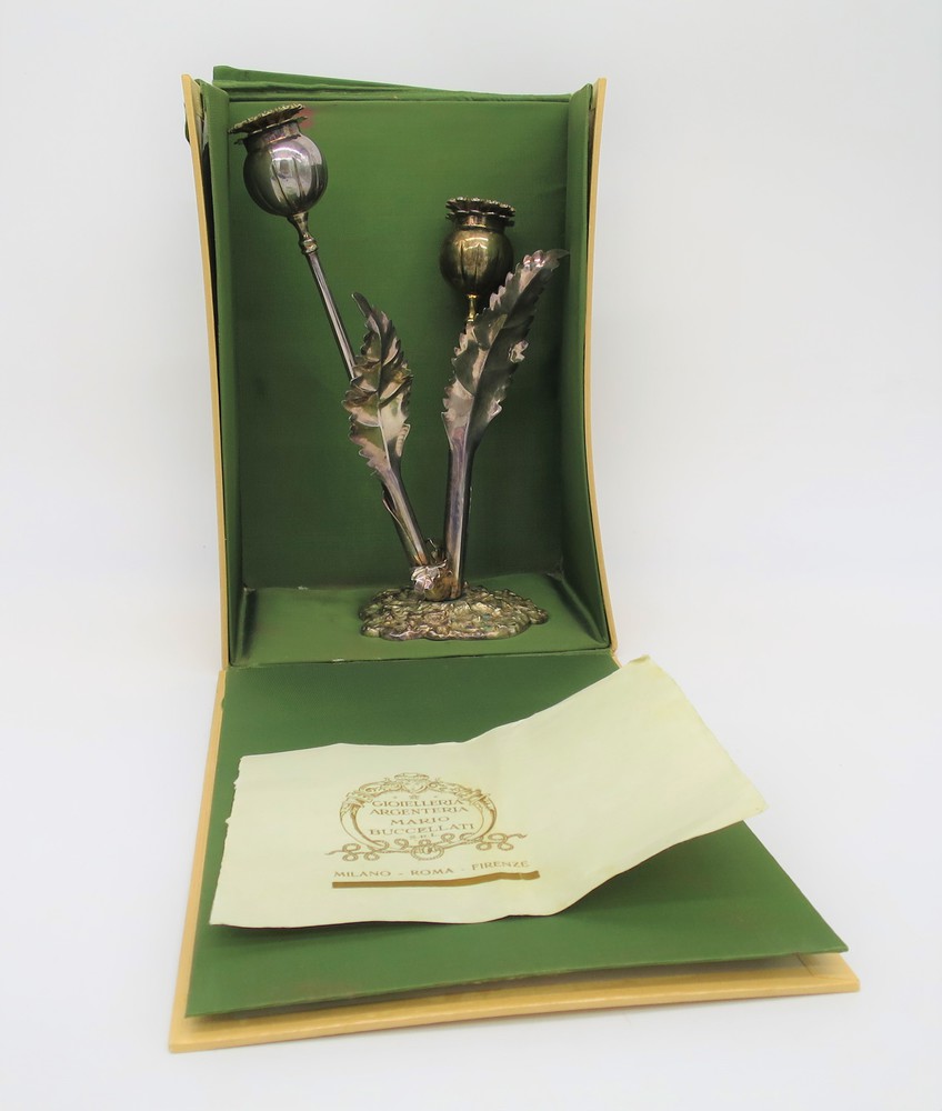 Rappresentato da due fiori poggianti entro base lavorata e cesellata con decori fogliacei.