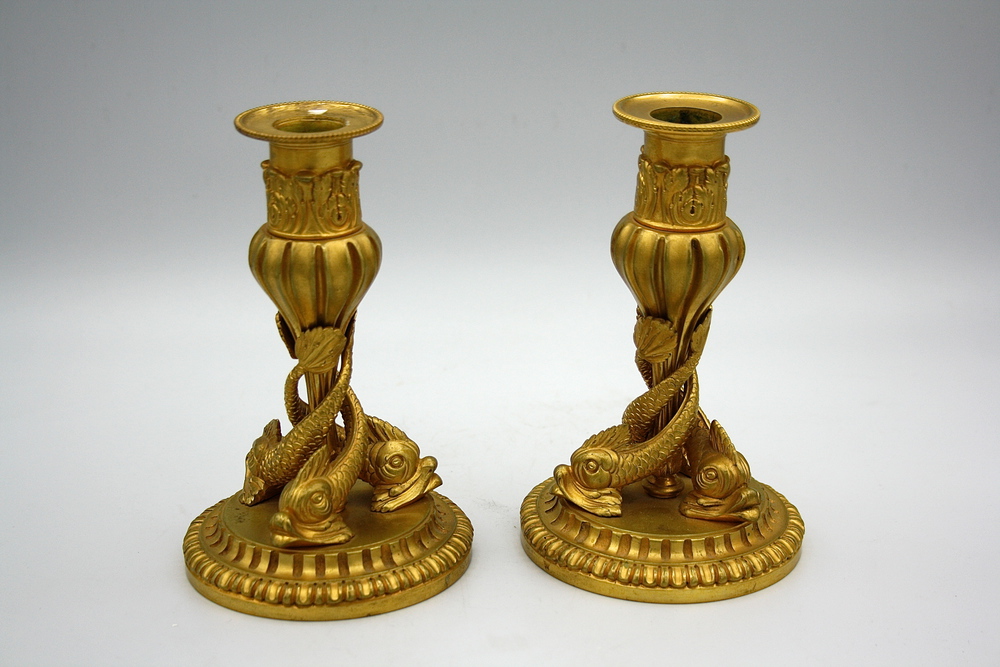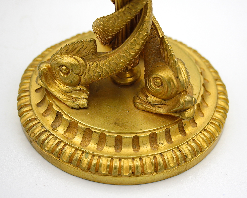 Rappresentati da tre delfini arrotolati su base circolare lavorata, porta candela lavorato.