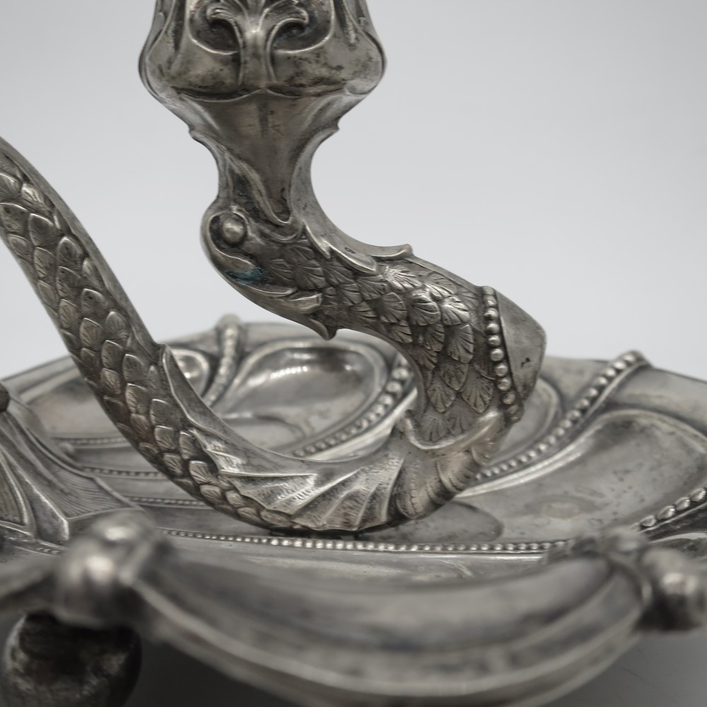 Corpi a foggia di conchiglia lavorata con impugnatura a rappresentare animale marino fantastico a sorreggere porta candela