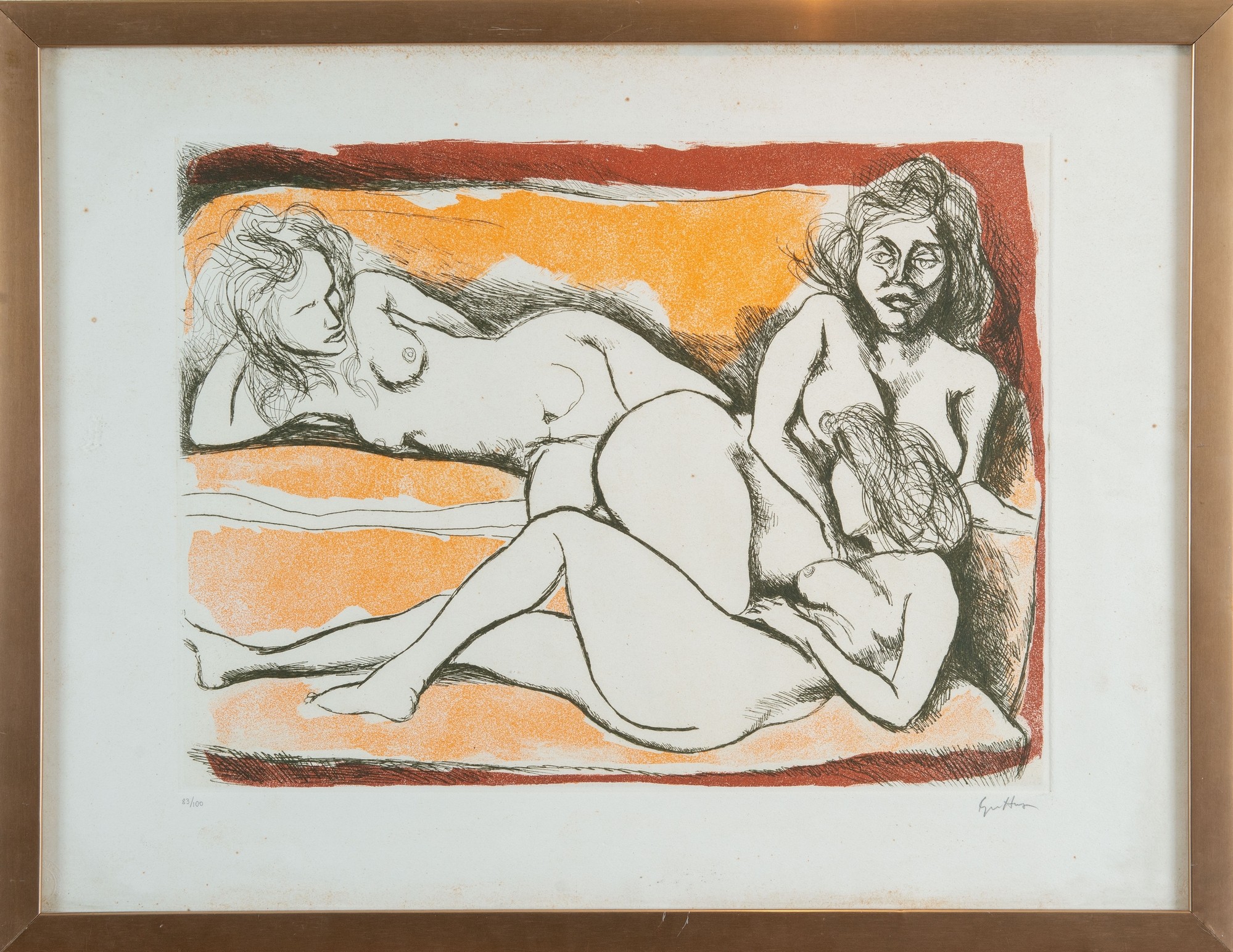 RENATO GUTTUSO (Bagheria 1991 – Roma 1987). “Nudi”. Litografia a colori su carta. Foglio: cm 50x65. Opera firmata in basso a destra Guttuso, numeri di tiratura in basso a sinistra 82/100.