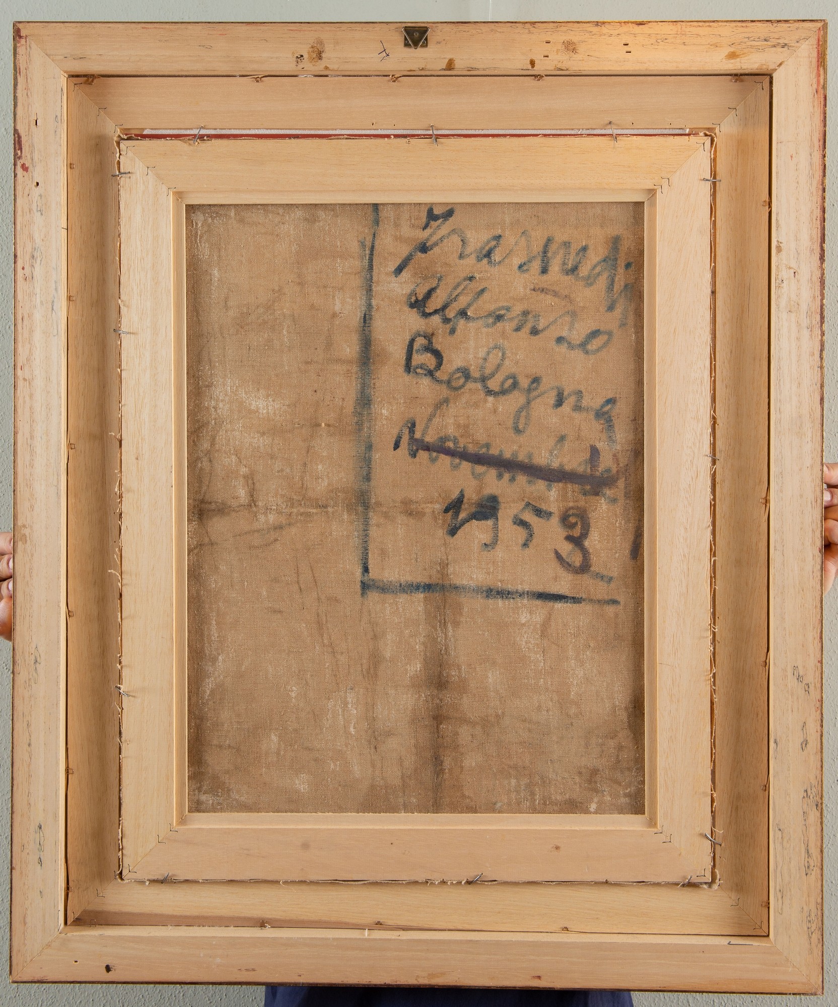 ALFONSO FRASNEDI (Bologna 1934). “Ritratto”, 1953. Olio su tela. Cm 64x51. Opera firmata in basso a destra Frasnedi, al retro opera firmata e datata Alfonso Frasnedi – Bologna - 1953.