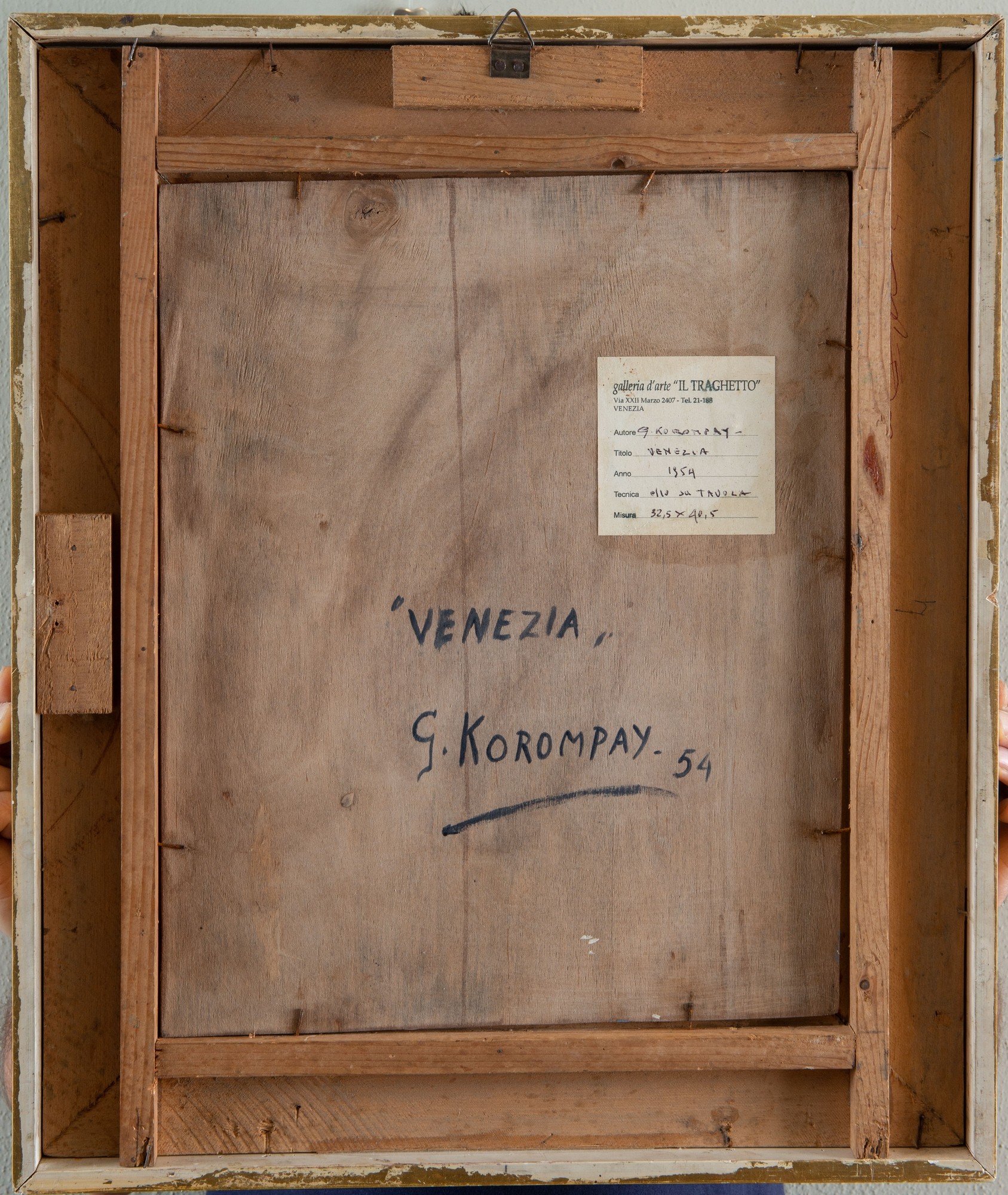 GIOVANNI KOROMPAY (Venezia 1904 – Rovereto 1988). “Venezia”, 1954. Olio su tavola. Cm 40,5x32,5. Opera firmata in basso a destra G.Korompay. Al retro opera intitolata, firmata e datata “Venezia, G.Korompay 54”. Reca etichetta della galleria d’arte “Il Traghetto Venezia”. Opera accompagnata da autentica su fotografia.
