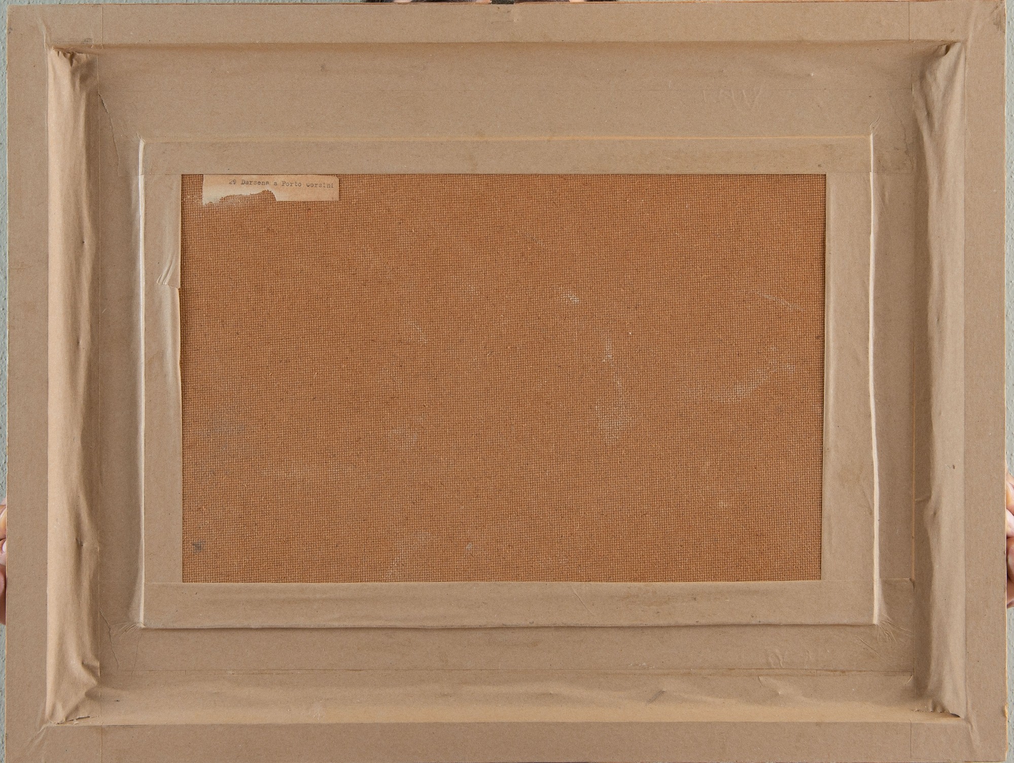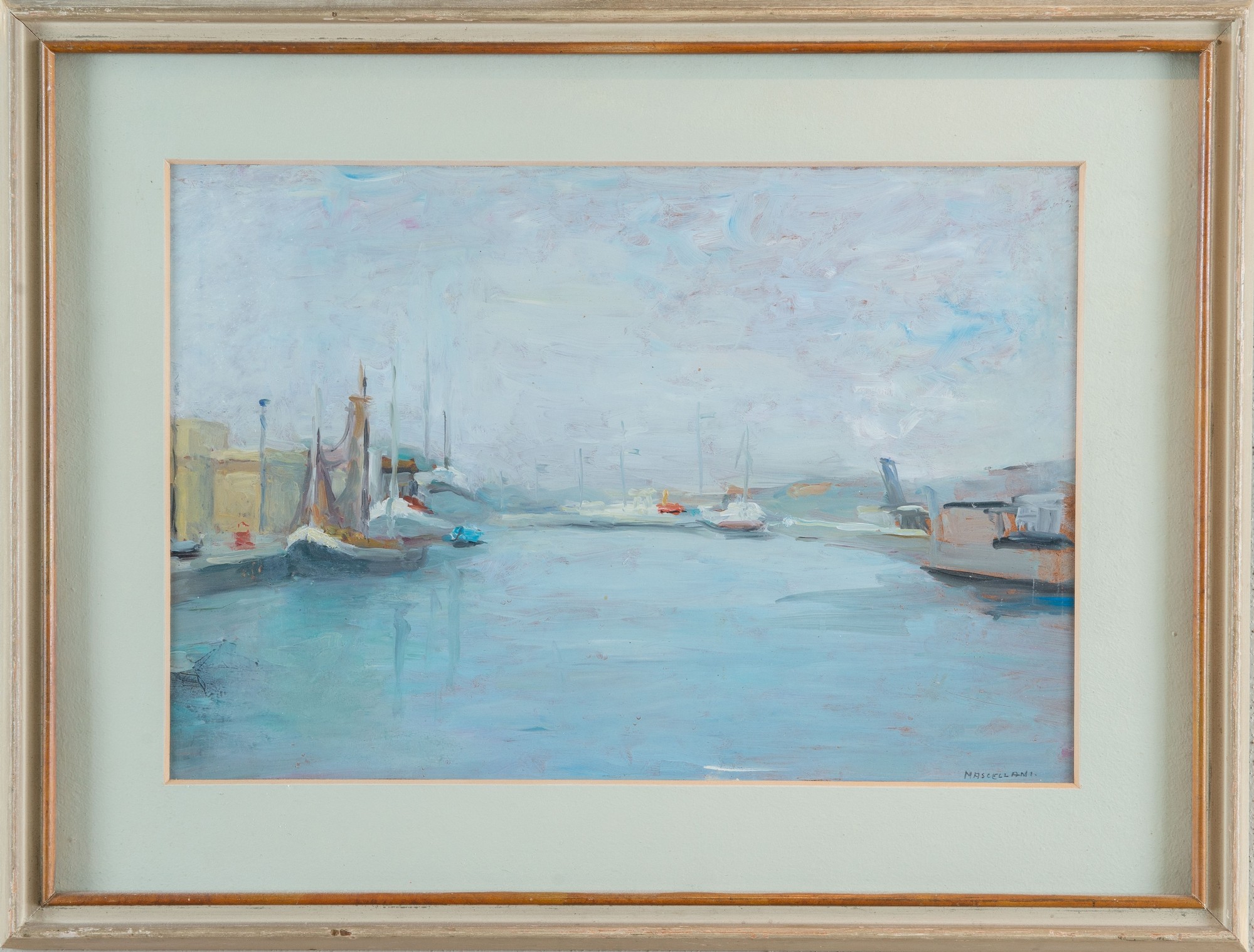 NORMA MASCELLANI (Bologna 1909 – 2009). “Darsena a Porto Corsini”, anni ’50. Olio su faesite. Cm 30x44,5. Opera firmata in basso a destra Mascellani. Al retro presenta cartiglio recante la scritta “29 Darsena a Porto Corsini”.