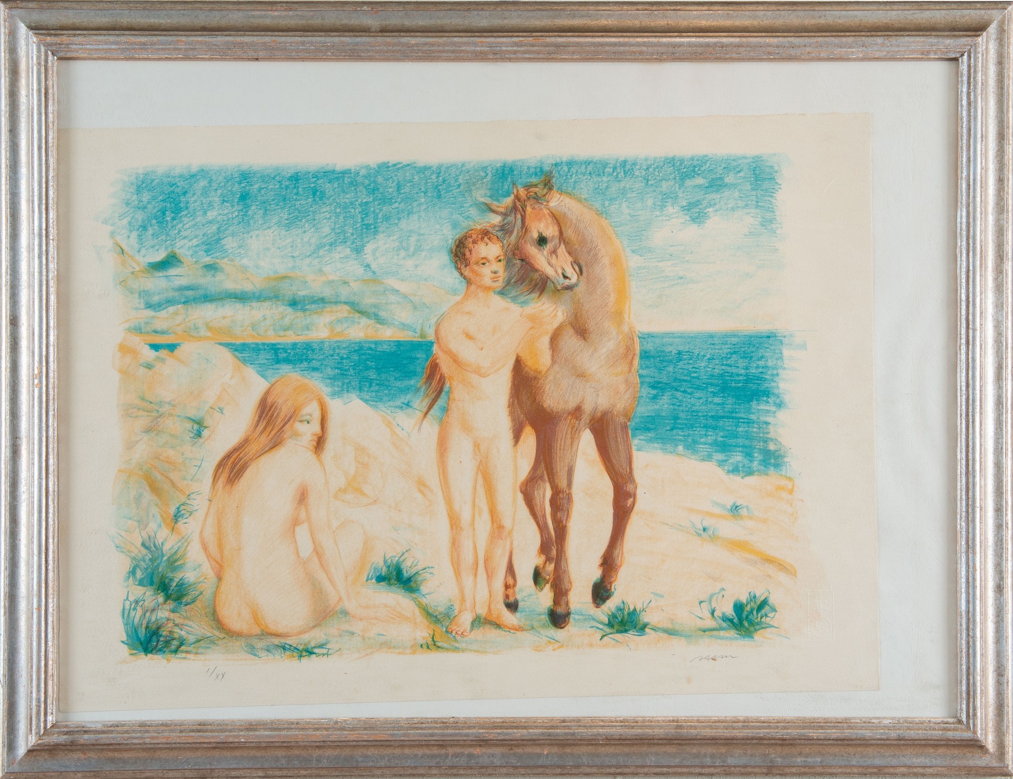 ALIGI SASSU (Milano 1912 - Pollenca 2000). "Coppia con cavallo". Litografia a colori su carta. Foglio: cm 50x70. Opera firmata in basso a destra Sassu, numeri di tiratura in lettere romane in basso a sinistra I/XX. Reca Timbro in basso a destra.