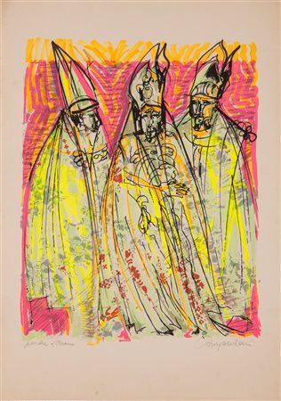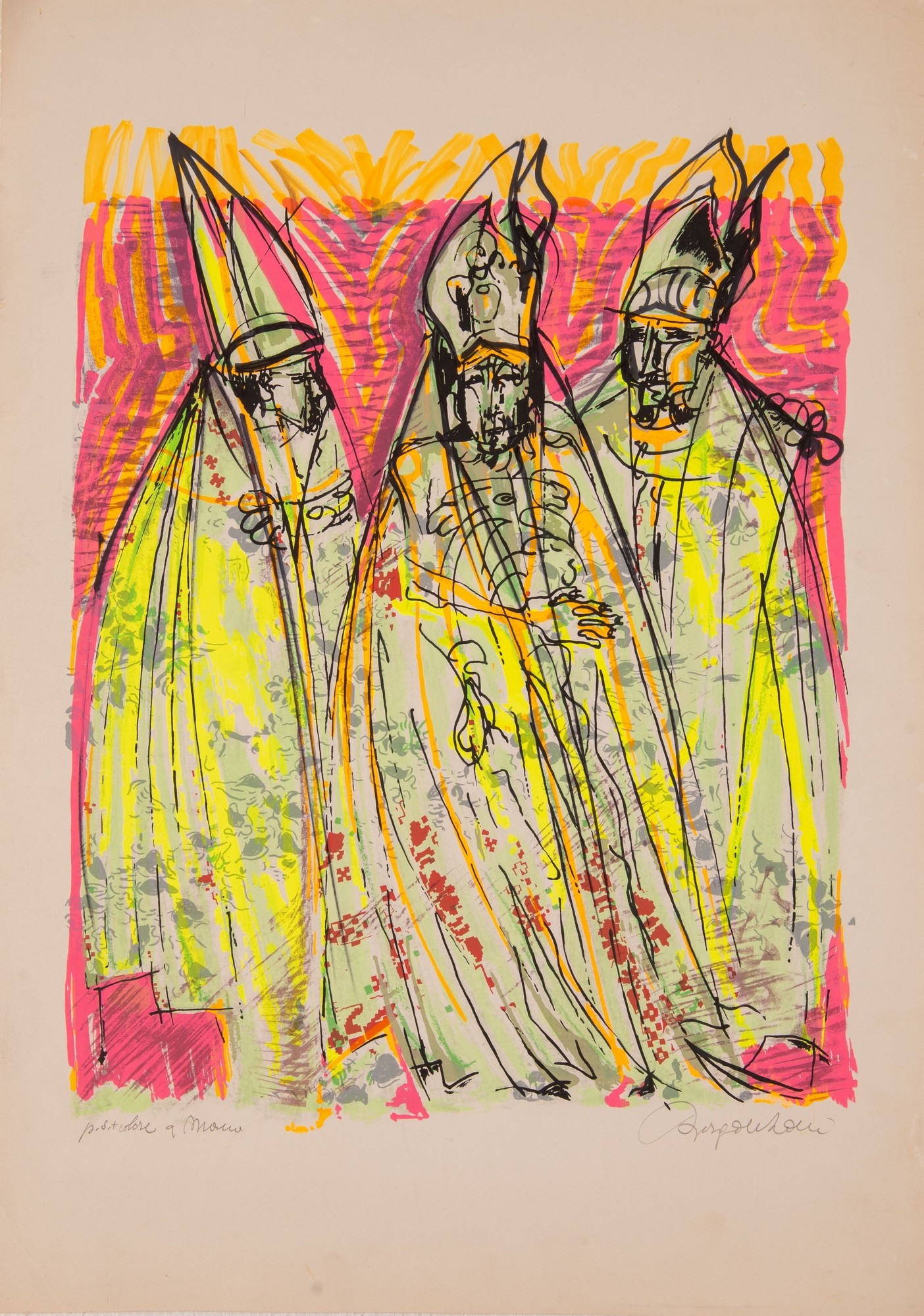 ALDO BORGONZONI (Medicina 1913 – Bologna 2004). “Cardinali”. Litografia a colori con intervento originali dell’artista su carta. Cm 70x50. Opera firmata in basso a destra Borgonzoni e con numero di tiratura in basso a sinistra P.S. Reca scritta “+ colore a mano”.