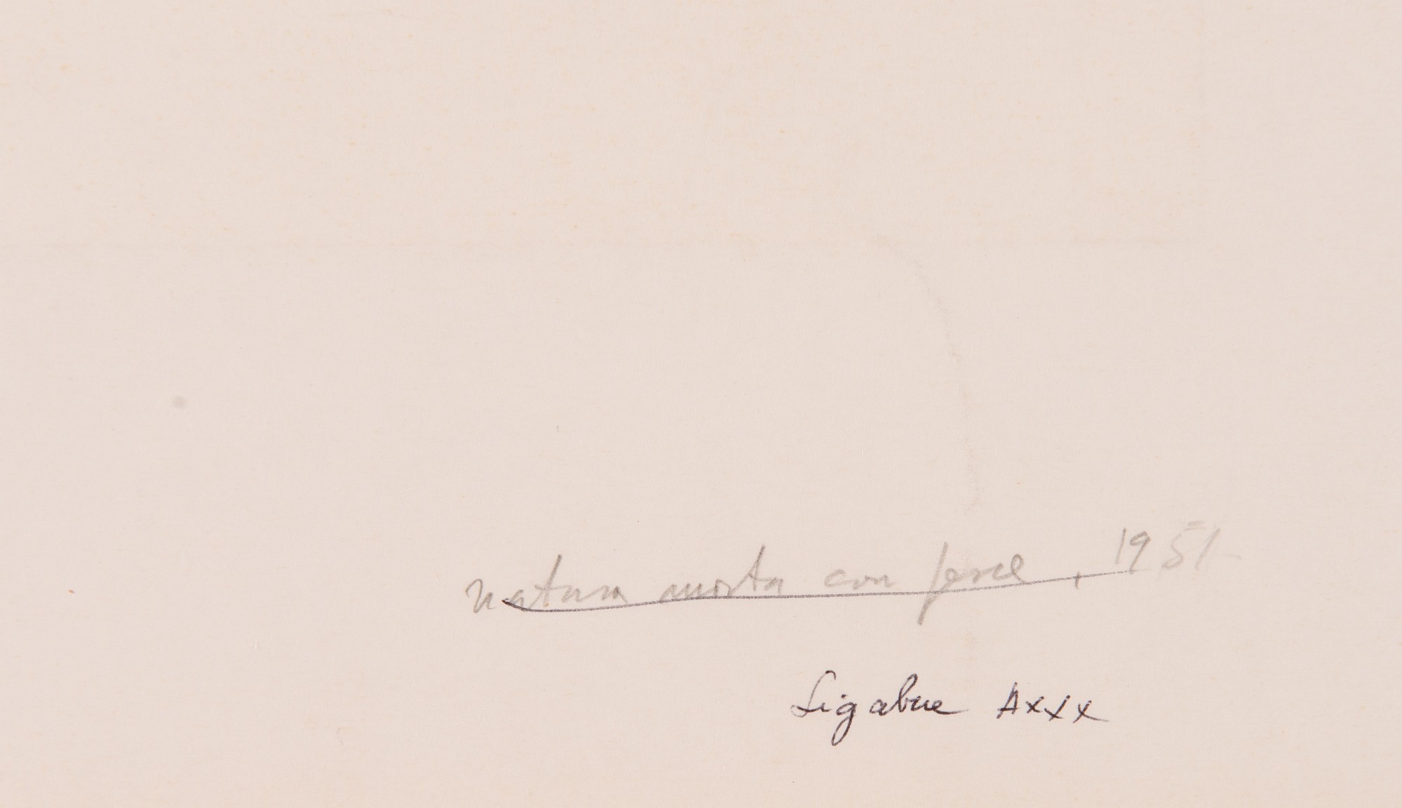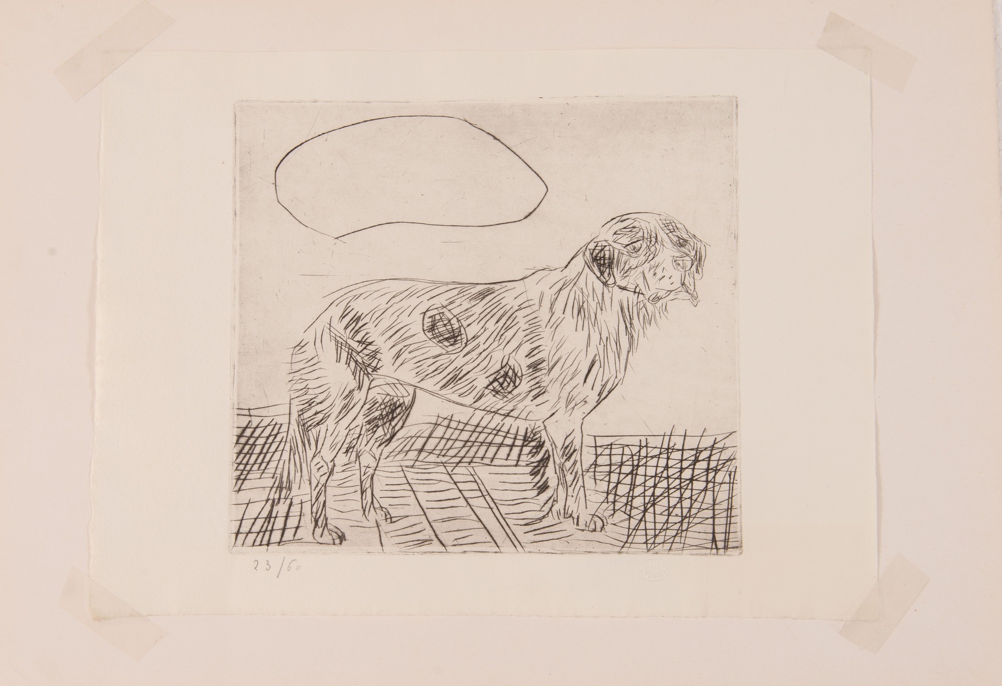 ANTONIO LIGABUE (Zurigo 1899 – Gualtieri 1965). “Cane”. Acquaforte su carta. Lastra: cm 23x25. Foglio: cm 28x38. Numeri di tiratura in basso a sinistra 23/60. Reca timbro a secco in basso a destra “Barcaccia – Reggio E”. Al retro reca etichetta e timbro con firma per autentica della Galleria d’arte Barcaccia di Reggio Emilia.