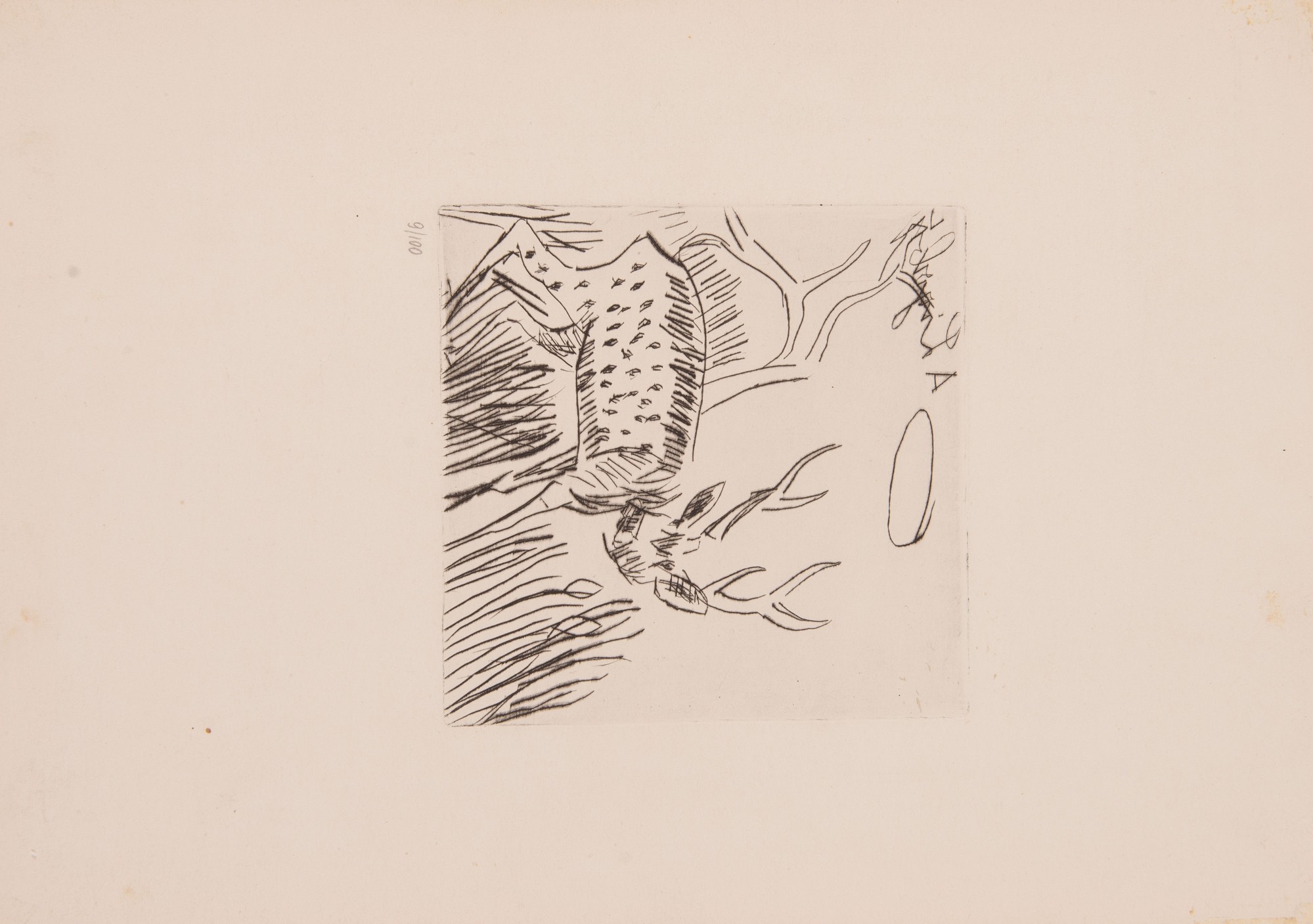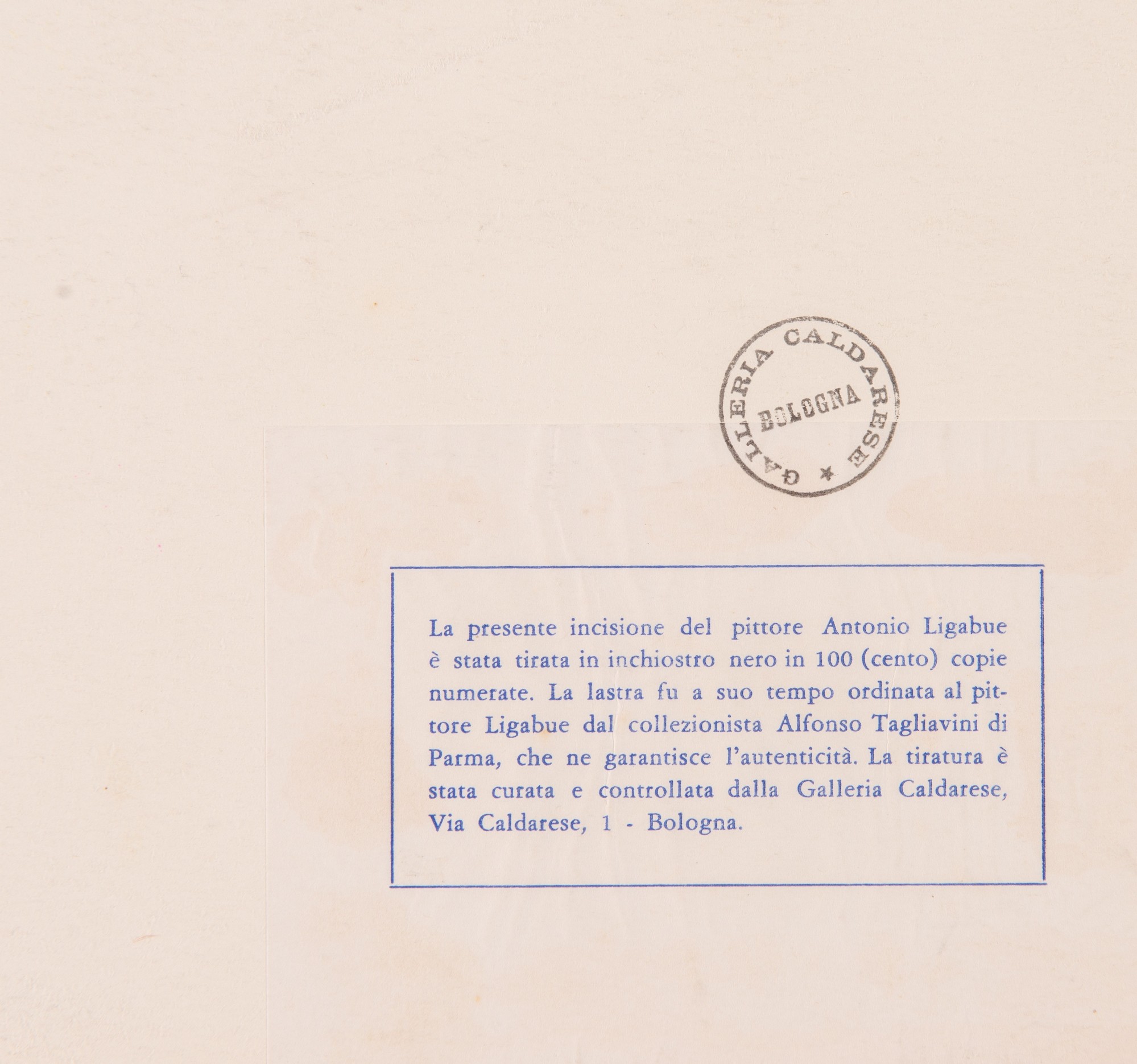 ANTONIO LIGABUE (Zurigo 1899 – Gualtieri 1965). “Cervo”. Acquaforte su carta. Lastra: cm 17,5x17,5. Foglio: cm 44,5x31,5. Numeri di tiratura in basso a sinistra 9/100. Al retro reca etichetta e timbro per autentica della Galleria d’arte Caldarese di Bologna.
