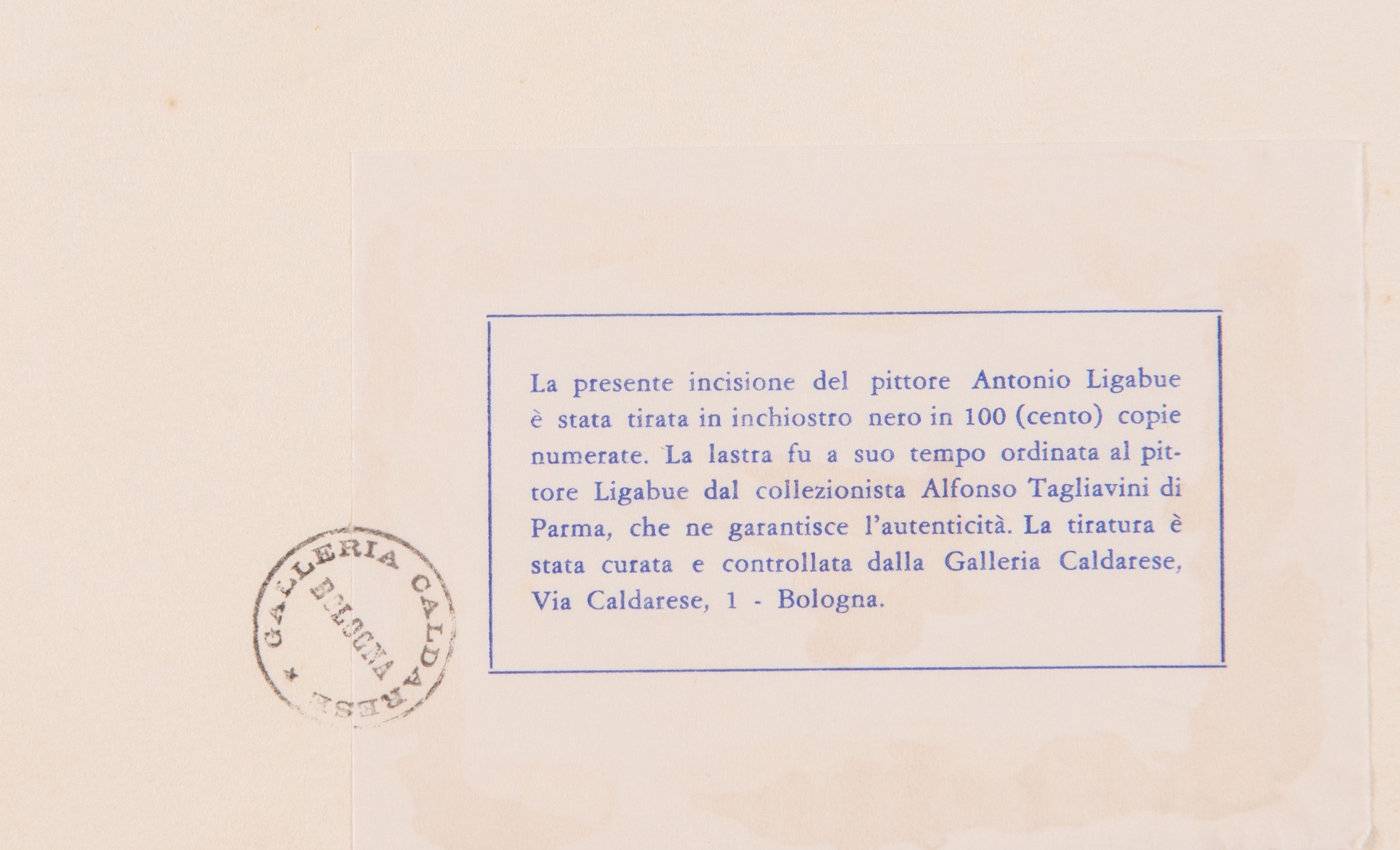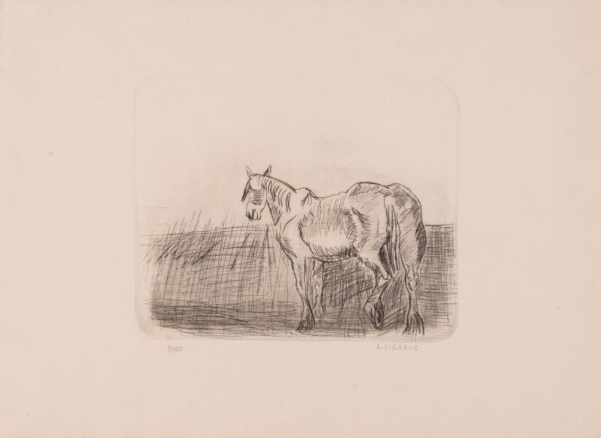 ANTONIO LIGABUE (Zurigo 1899 – Gualtieri 1965). “Cavallo”. Acquaforte su carta. Lastra: cm 23x28. Foglio: cm 39x53. Numeri di tiratura in basso a sinistra 9/100. Al retro reca etichetta e timbro per autentica della Galleria d’arte Caldarese di Bologna.
