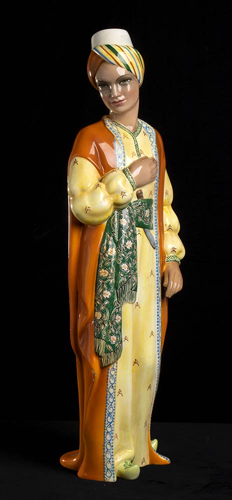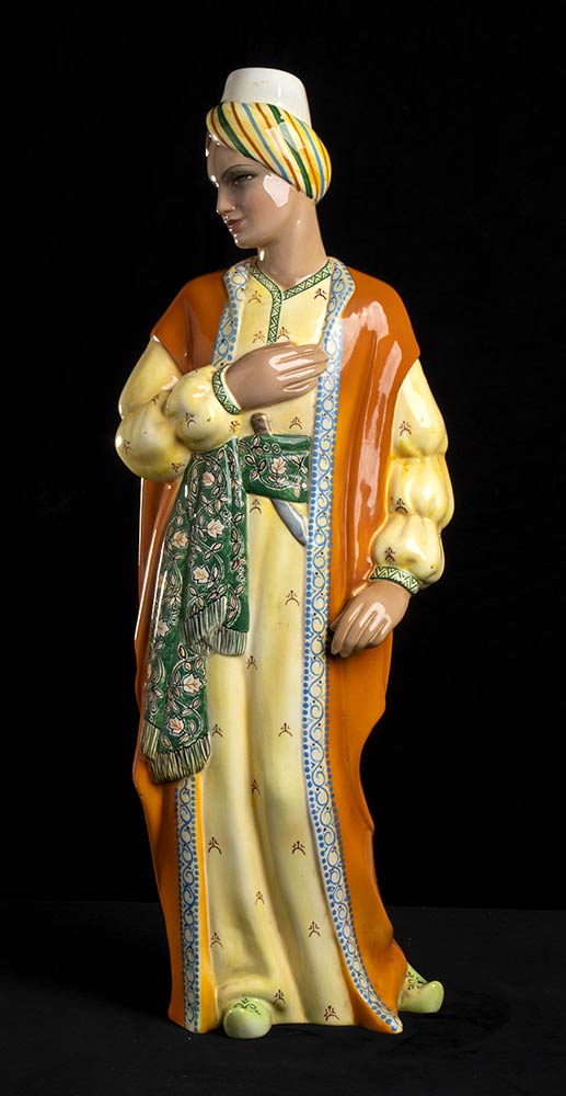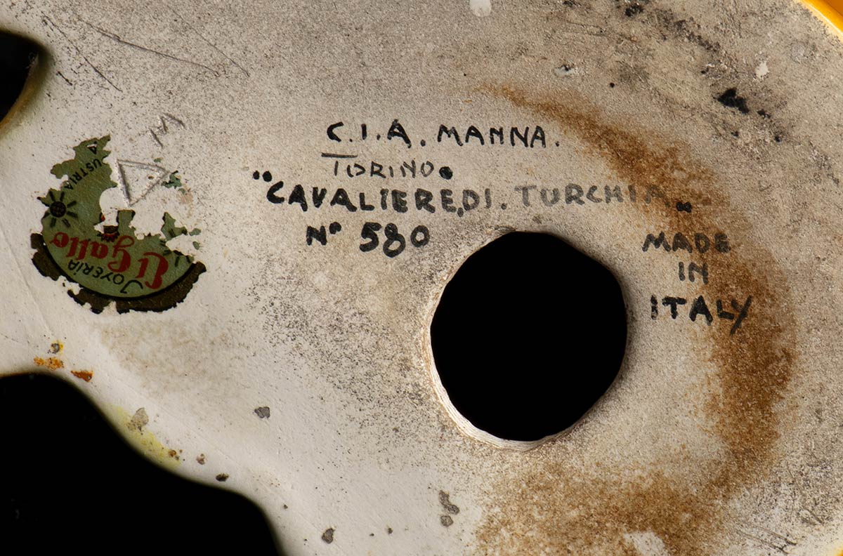 Earthenware sculpture of a knight with polychromy decoration. Brand on the base: MANNA TORINO “CAVALIERE DI TURCHIA” MADE IN ITALY n. 580.