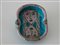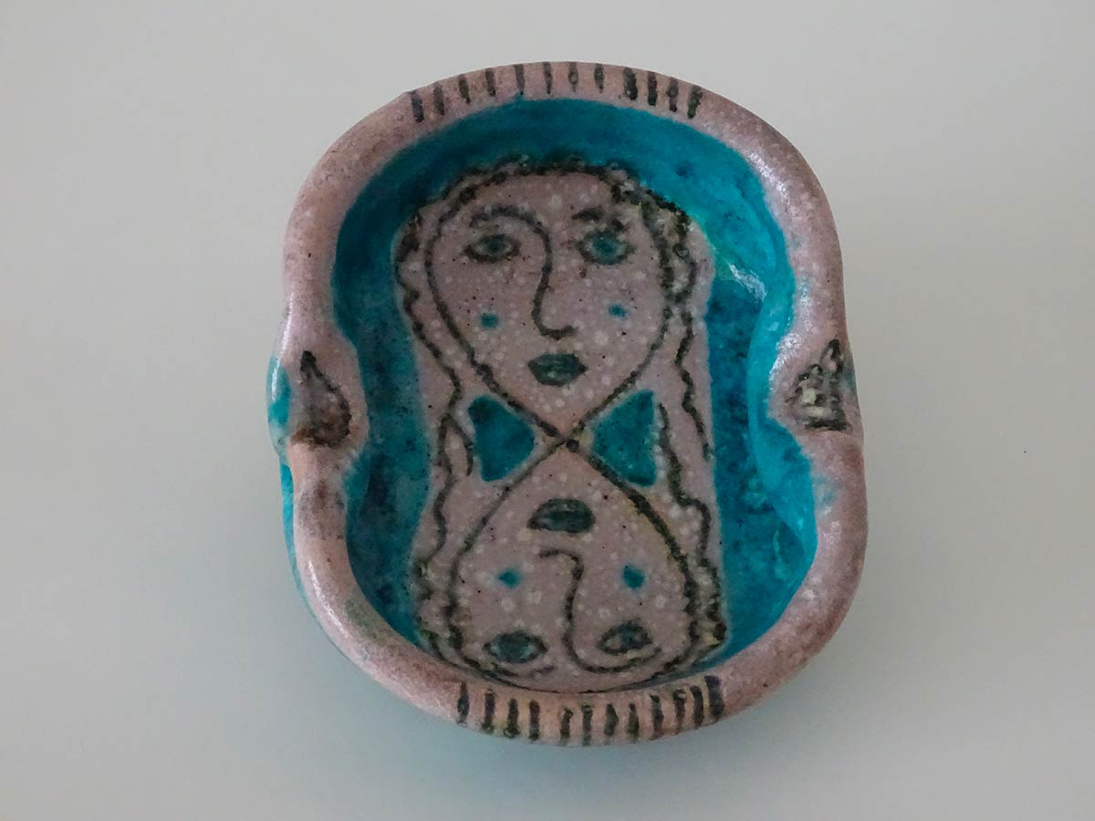 Ceramic ashtray decorated by light-blue, green and blue enamels under glazed. The decoration represent two faces in the shape of a hourglass. Signed under the base with the graphic symbol of the little donkey.