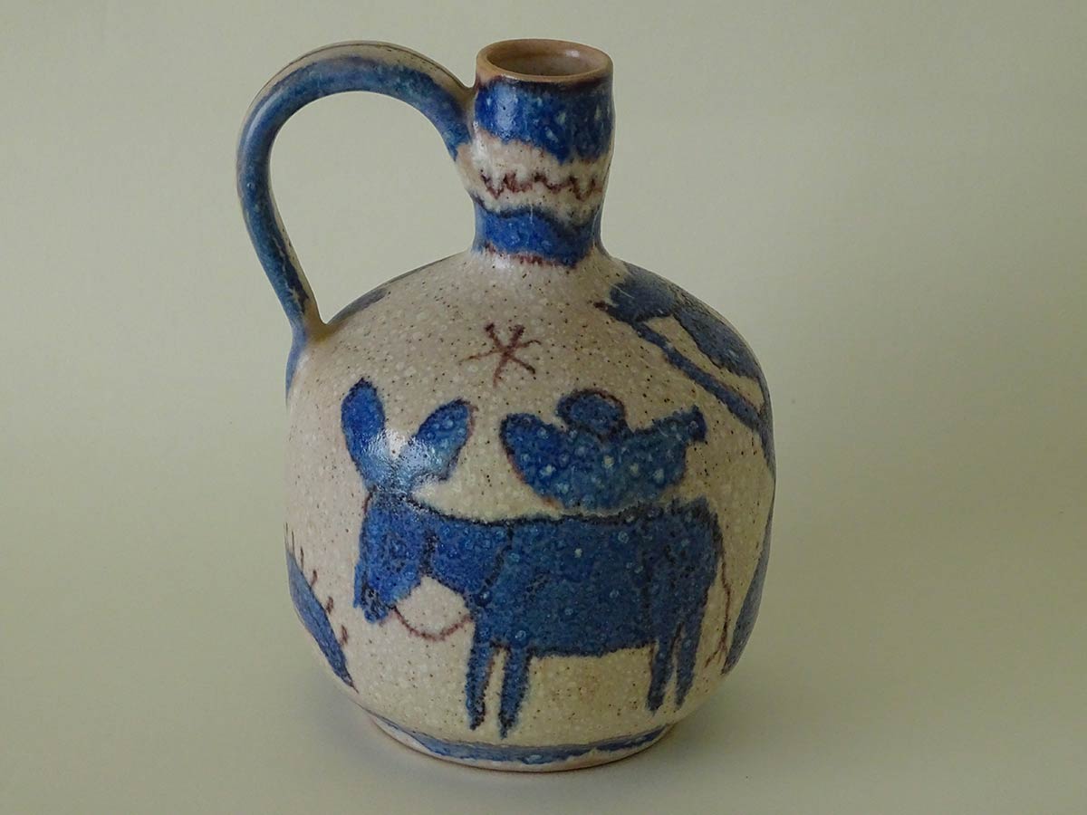 Ceramic Jug representing a peasant and a little donkey with light-blue decoration under the glazed. Signed under the base with the graphic symbol of the little donkey.