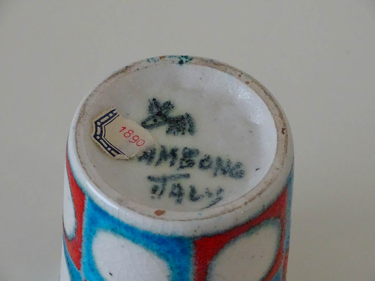 Ceramic plate and cup with light-blue, red and blues enamels under glazed. Signed under the base with the graphic symbol of the little donkey.