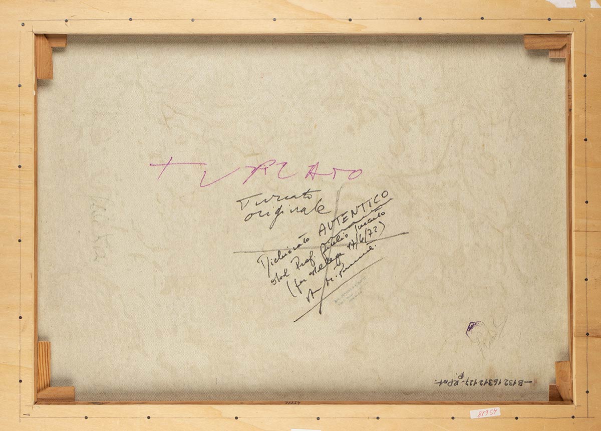 Iscrizione al retro: “Turcato originale, Dichiarato autentico dal Prof. Giulio Turcato, per delega 17/5/72”