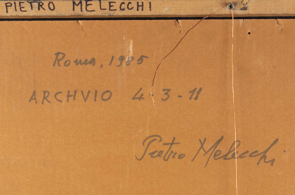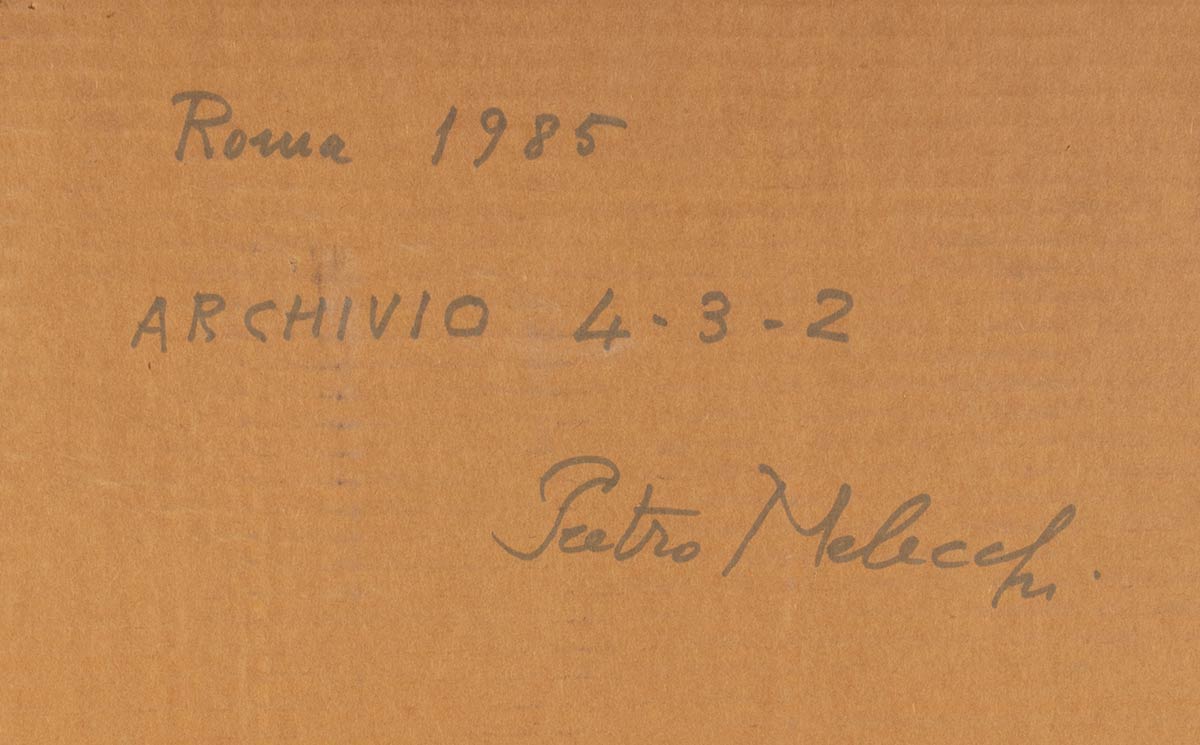 Firma, luogo, data e numero d’archivio al retro: Pietro Melecchi, Roma 1985, Archivio 4-3-2